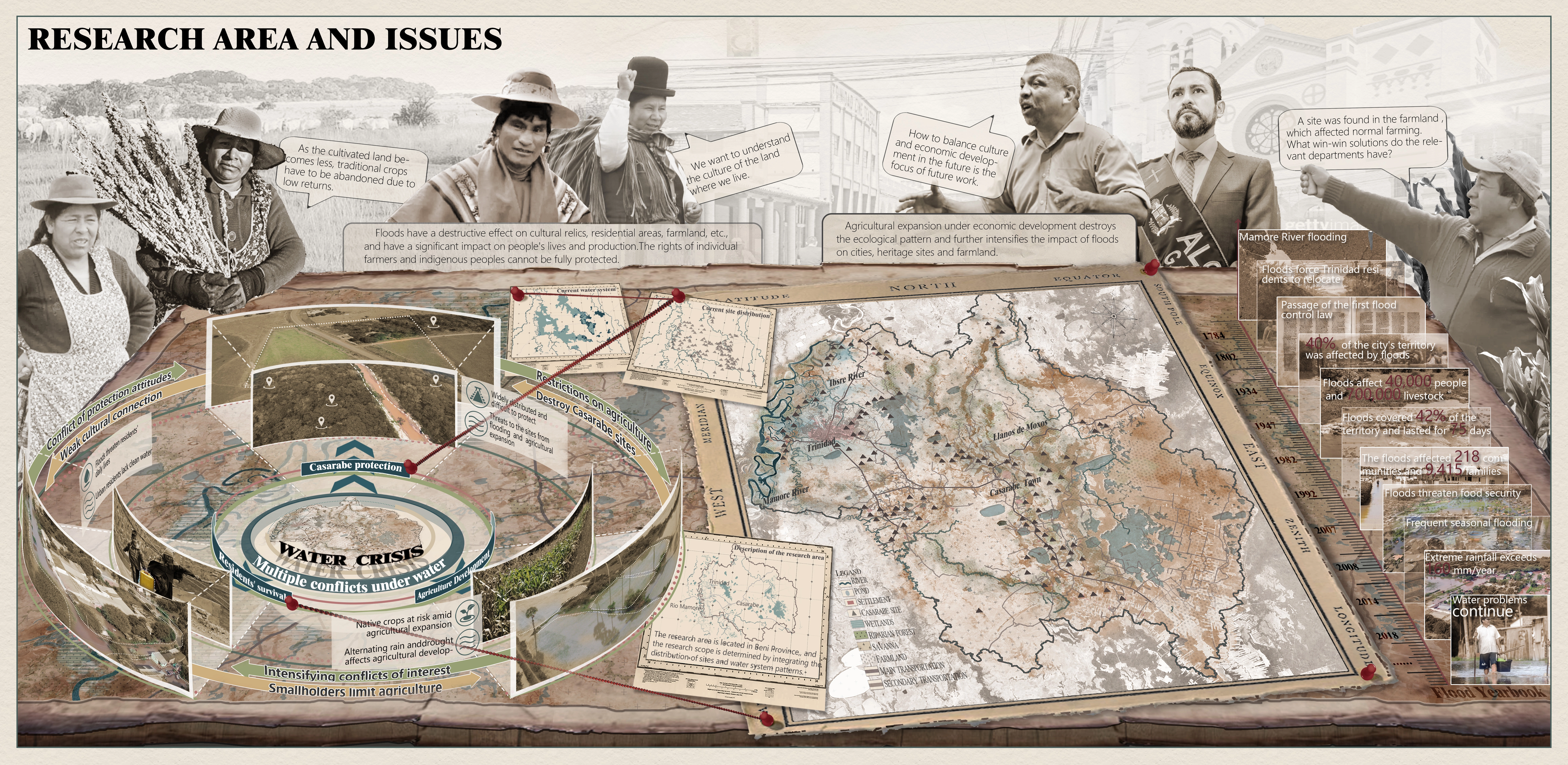 At the Casarabe heritage landscape in Beni Province, seasonal droughts and floods create water crises that threaten local communities, agriculture, and archaeological sites. The ancients countered extremes with ponds, canals, raised fields, and mounds, forming a resilient mosaic landscape. Drawing on three water-wisdom legacies—Flood Management, Efficient Agricultural Water Use, and Integrated Water Culture—we establish a Flood Management Network, an Agricultural Water Ecology Network, and a Sites Water Context Network. This heritage-informed, networked strategy balances ecological restoration, sustainable farming, and site conservation, offering an innovative, replicable model for resilient landscape stewardship.
