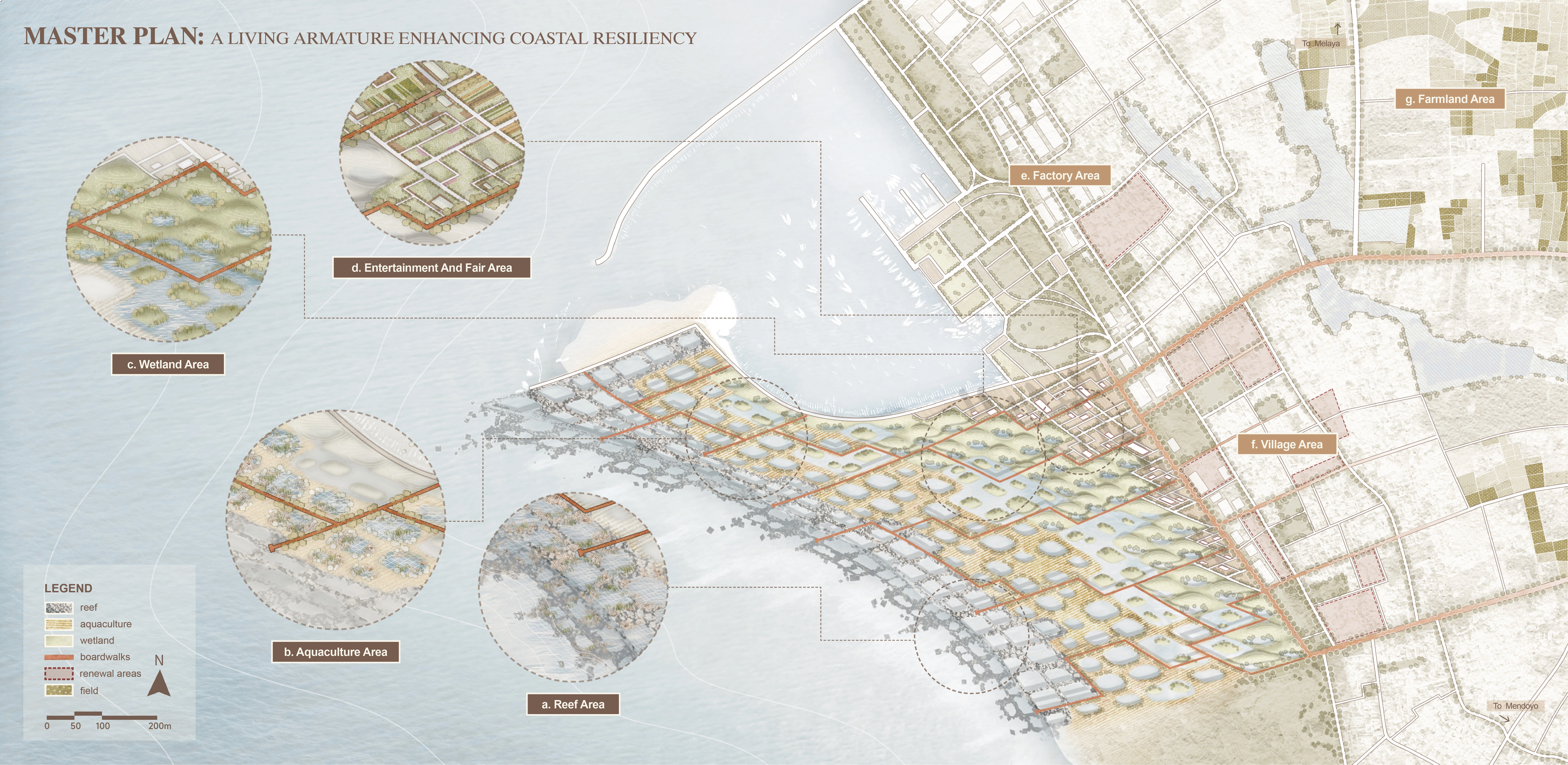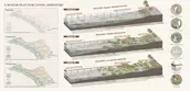 Shellfish meat supplies local restaurants; shells are crafted into handicrafts. A viewing trestle, built from recycled plastics, links the village to restored wetlands. Waves gradually reshape the shoreline, filling reefs with sediment to combat erosion. Degraded industrial zones transition into resilient wetlands, merging ecology with tourism appeal.