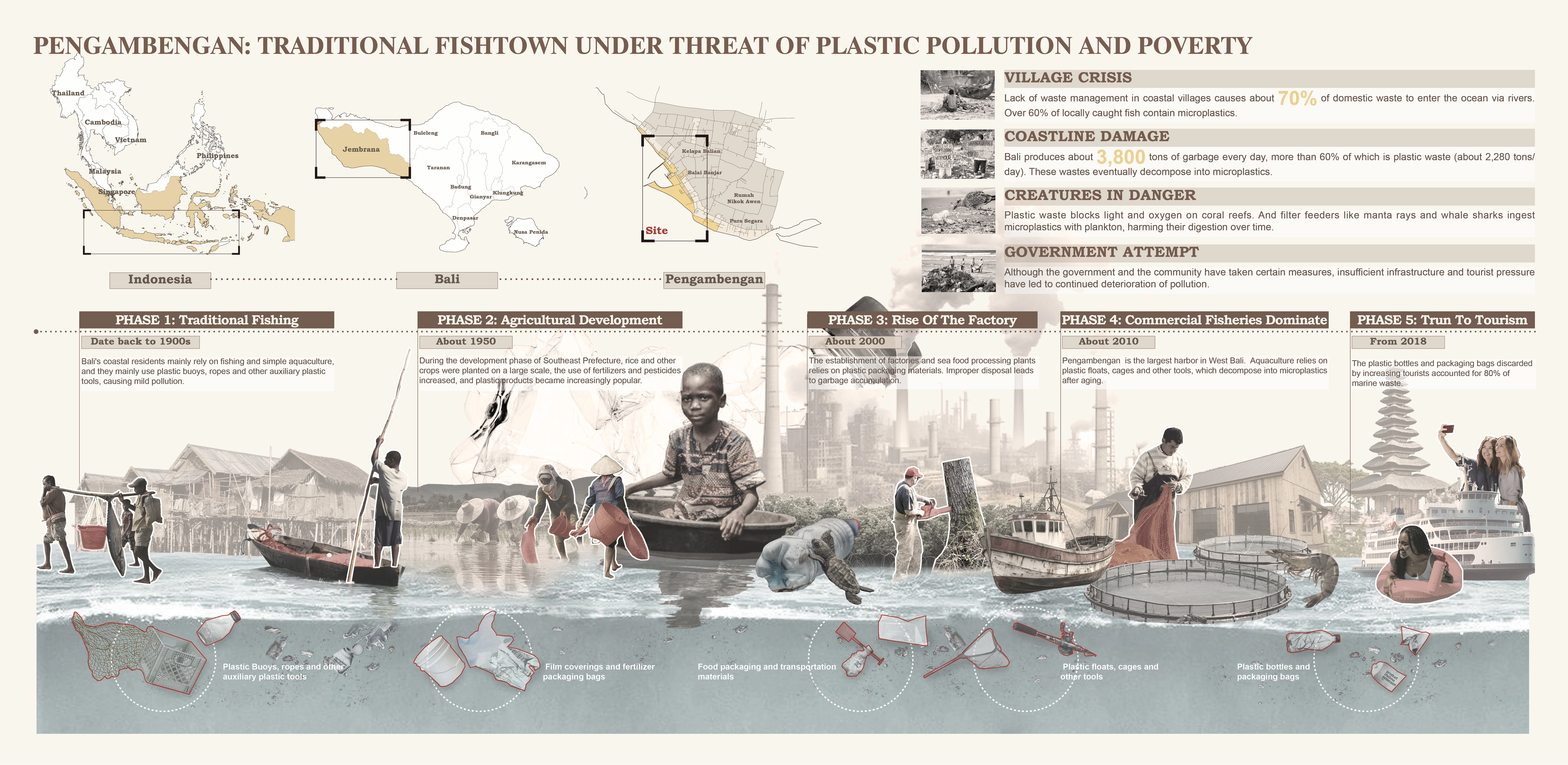 Bali faces severe microplastic pollution, with Indonesia recycling only 9% of its 400 million metric tons of annual plastic waste. Daily, 2,000 truckloads of plastic enter Bali’s waters, degrading into microplastics (<5mm)—“ocean PM2.5”—threatening ecosystems, fisheries, tourism, and human health. Pengambengan, a western Balinese fishing village, epitomizes this crisis, battling erosion, mangrove degradation, and pollution that undermine livelihoods and tourism.