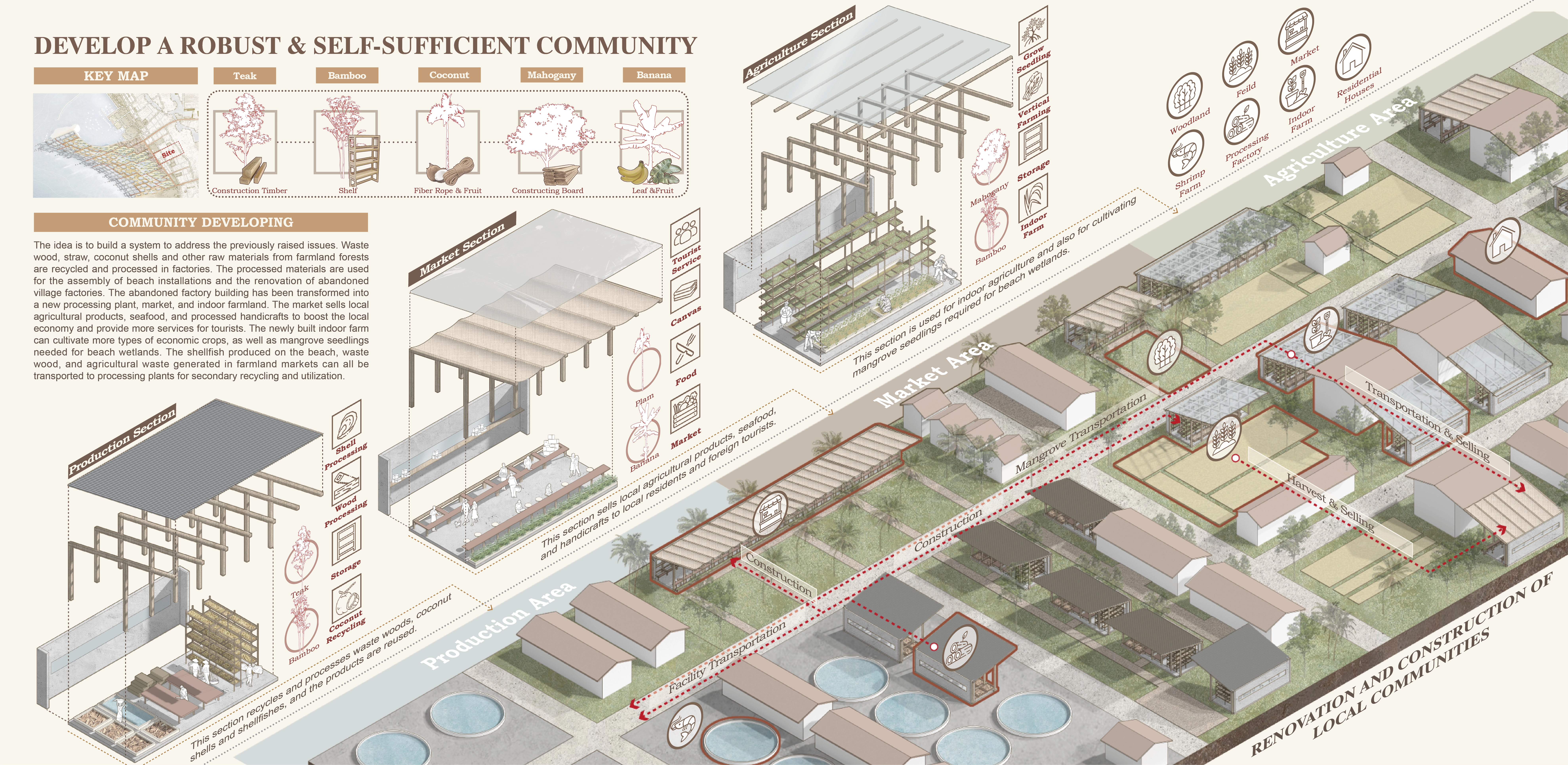 Southeast Asia’s coastal villages face converging crises: microplastic pollution, overexploited fisheries, and declining livelihoods. In Bali’s Pengambengan village, this project pilots a regenerative model rooted in shellfish reef ecology. Modular reef units—woven from recycled M-Basswood—foster shellfish growth, filter microplastics, and support aquaculture. Pollutant-laden fibers are repurposed into building panels, while harvested seafood feeds local businesses and crafts. A recycled plastic trestle links the village to restored tidal zones, drawing ecotourism. This evolving system offers a pathway to transform vulnerable fishing ports into resilient, self-sustaining coastal communities driven by ecological tourism.