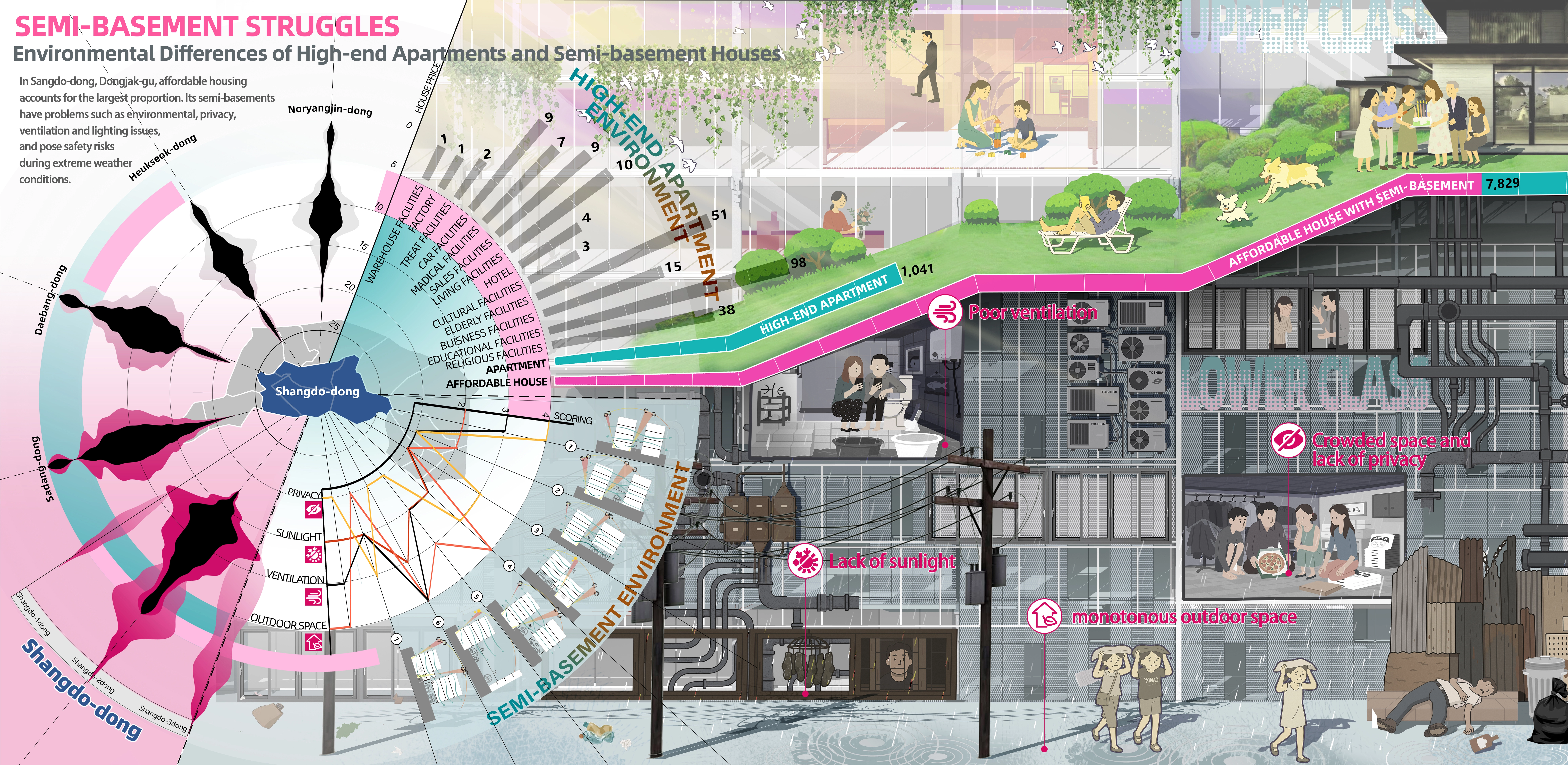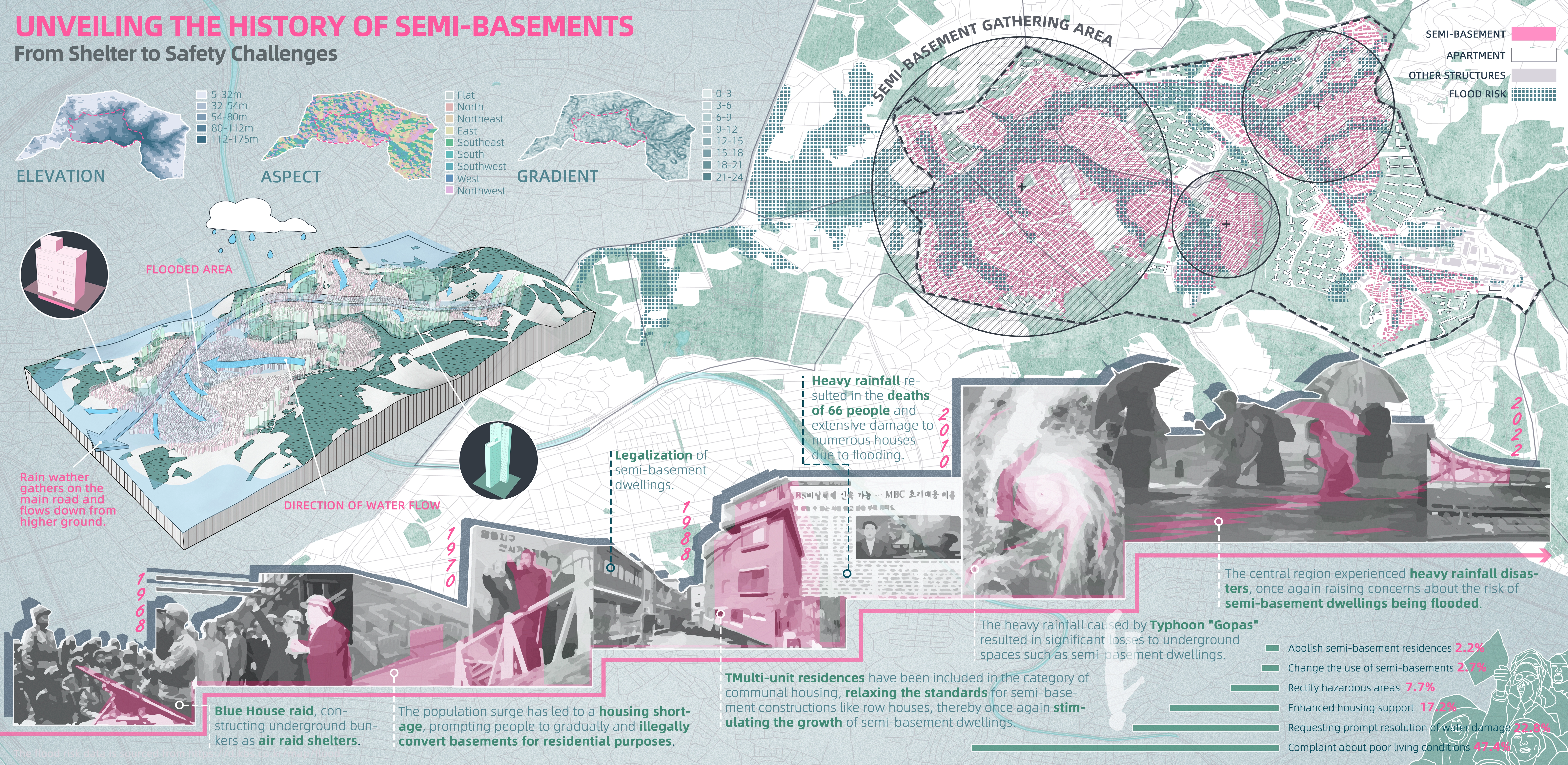 Seoul, the capital city of South Korea, faces significant challenges from heavy rainfall and urban flooding, with a particular impact on the semi-basement areas. These areas, located in low-lying regions, experience architectural constraints that lead to inadequate sunlight exposure and insufficient ventilation. As a consequence, residents in semi-basement communities endure environmental injustices and face greater vulnerability to flooding. The property damage and casualties caused by heavy rain disasters further exacerbate the existing wealth disparity in these areas.