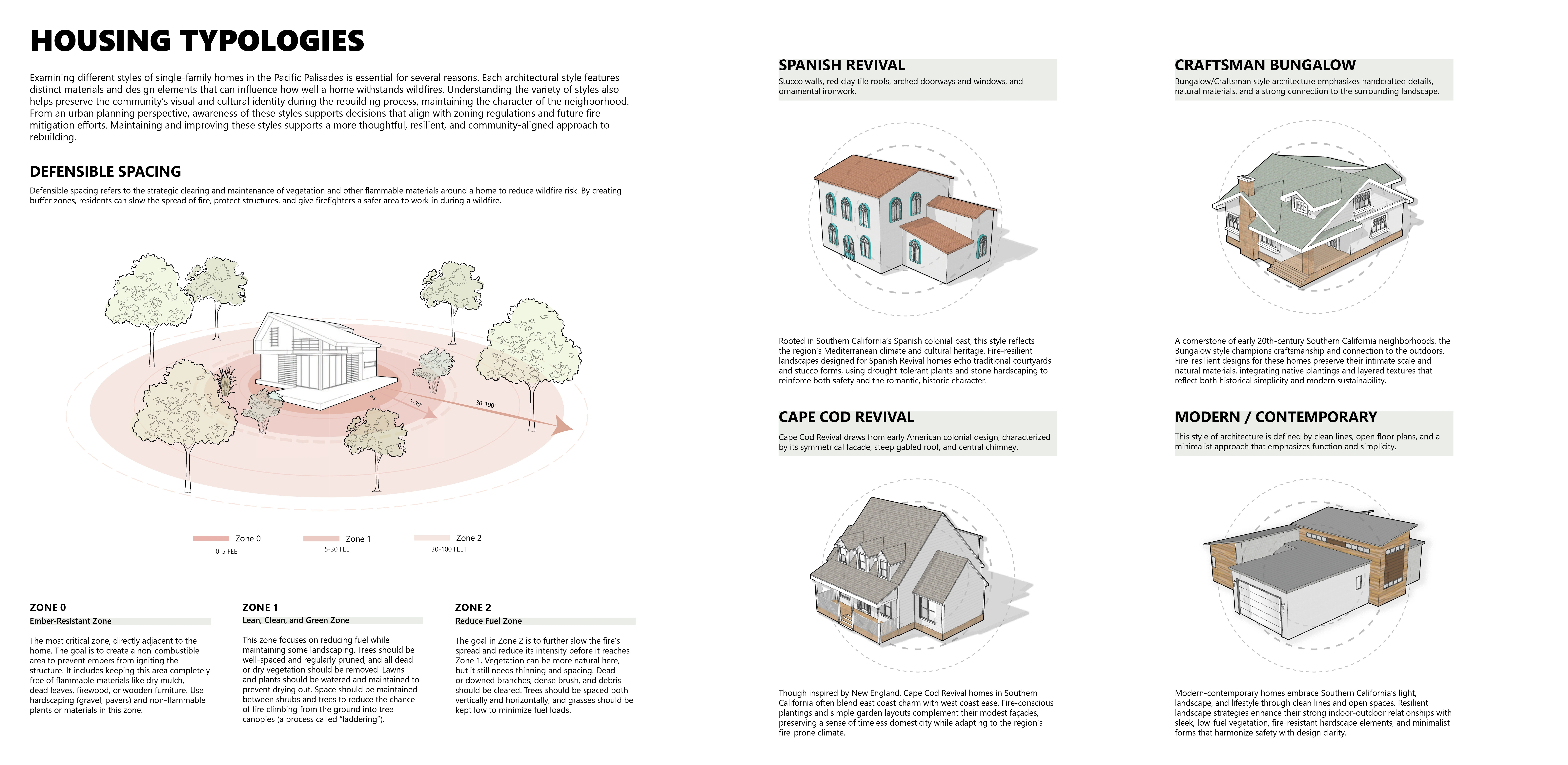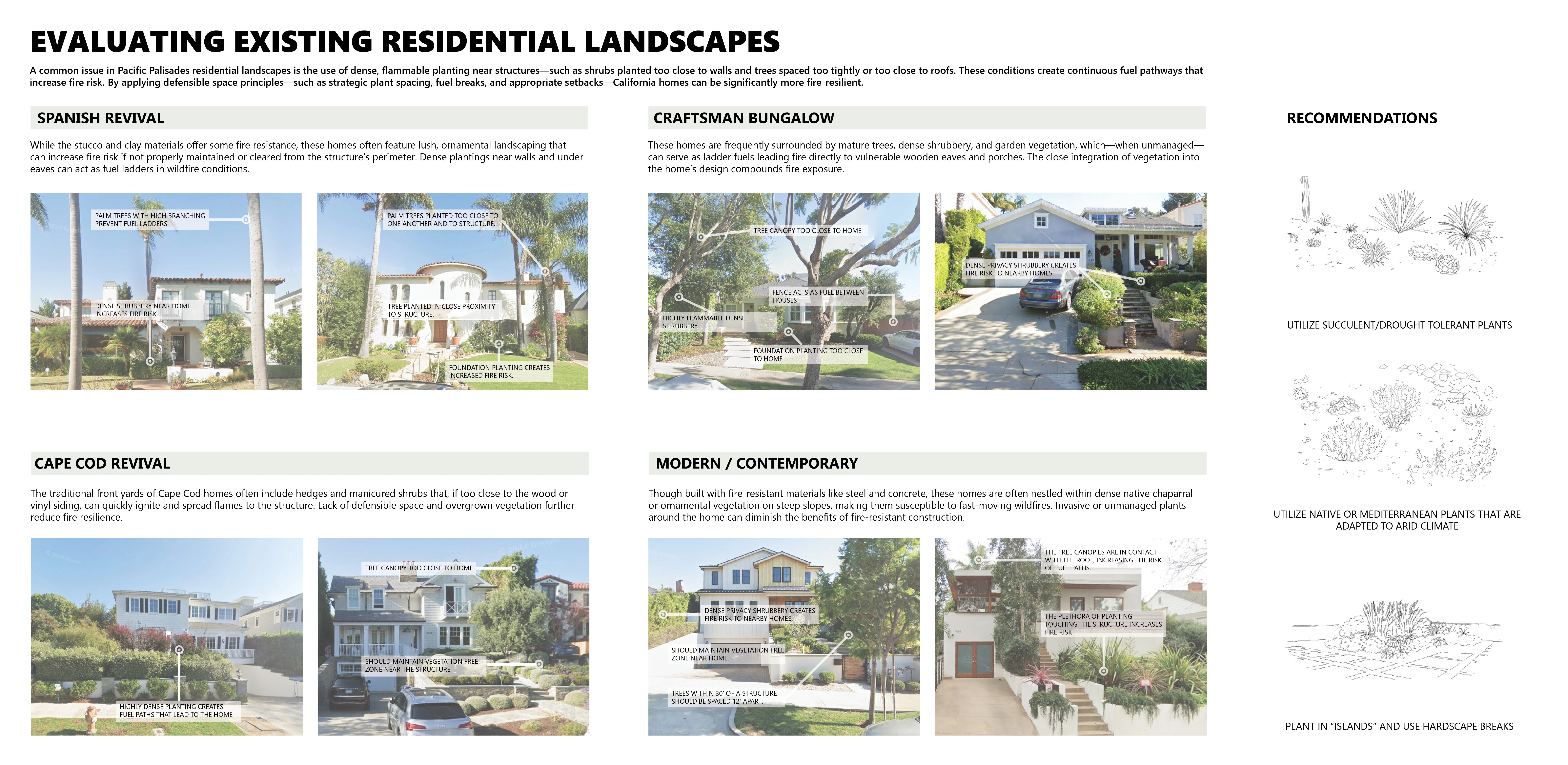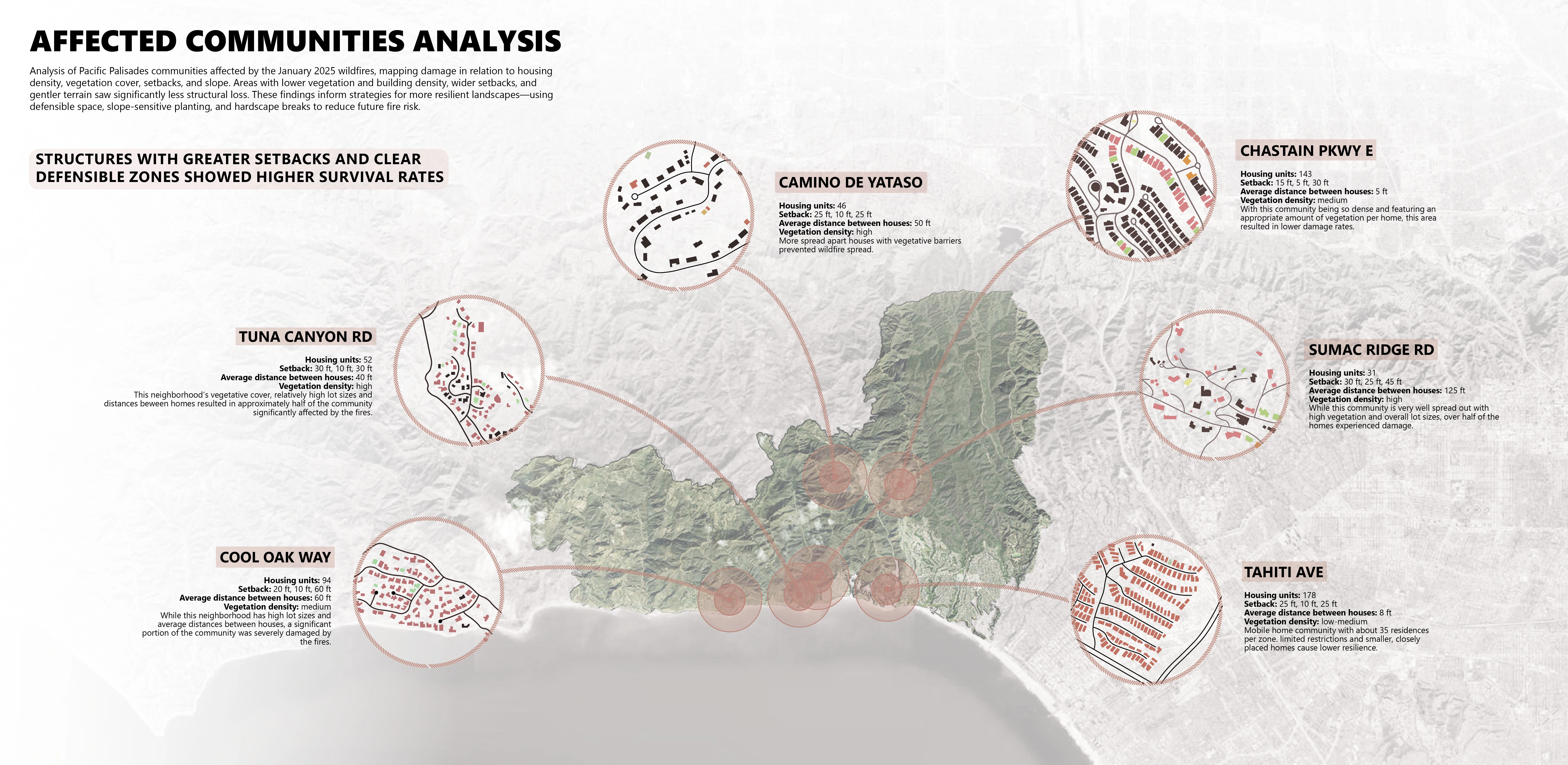 This project helps Pacific Palisades homeowners redesign landscapes to be more fire-resilient after the January 2025 wildfire. Grounded in extensive analysis of California’s fire history, vegetation, climate, and residential vulnerabilities, we developed site-specific toolkits and planting palettes tailored to local architecture. The design acknowledges zoning constraints and supports rebuilding on original sites. This work is award-worthy for its timely response to climate-driven disasters, integration of science with design, and its potential to guide resilient rebuilding in fire-prone communities statewide.