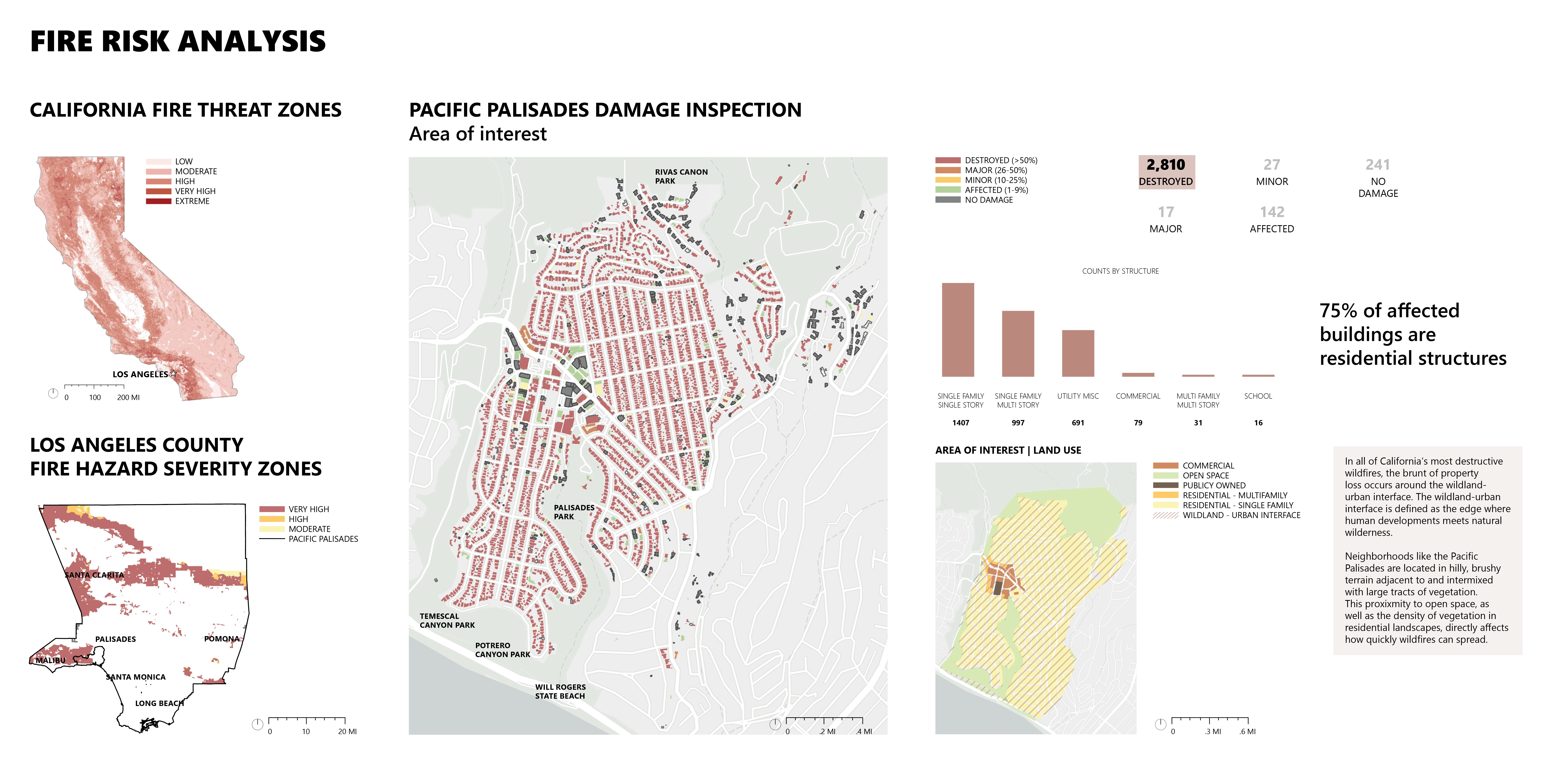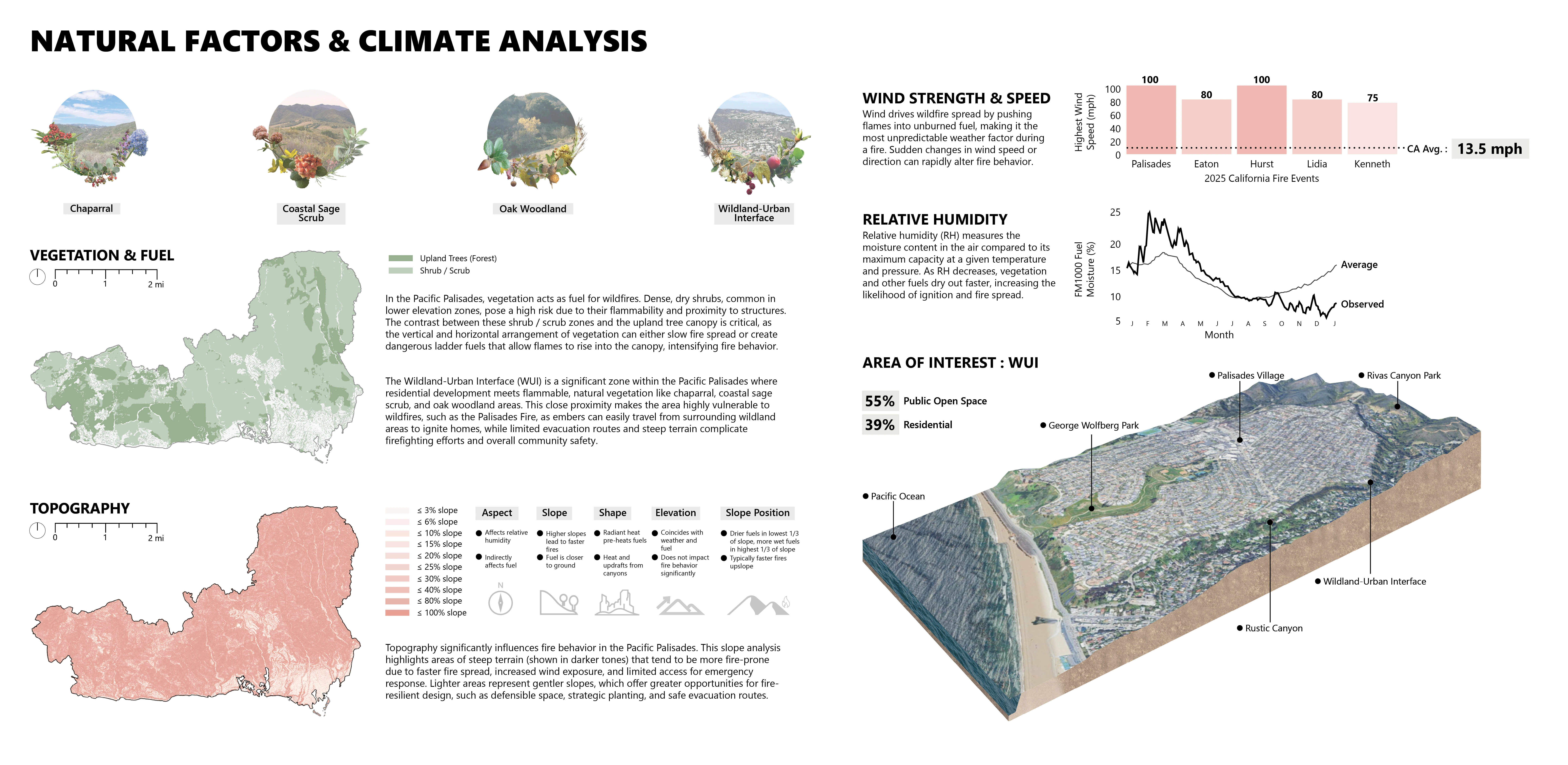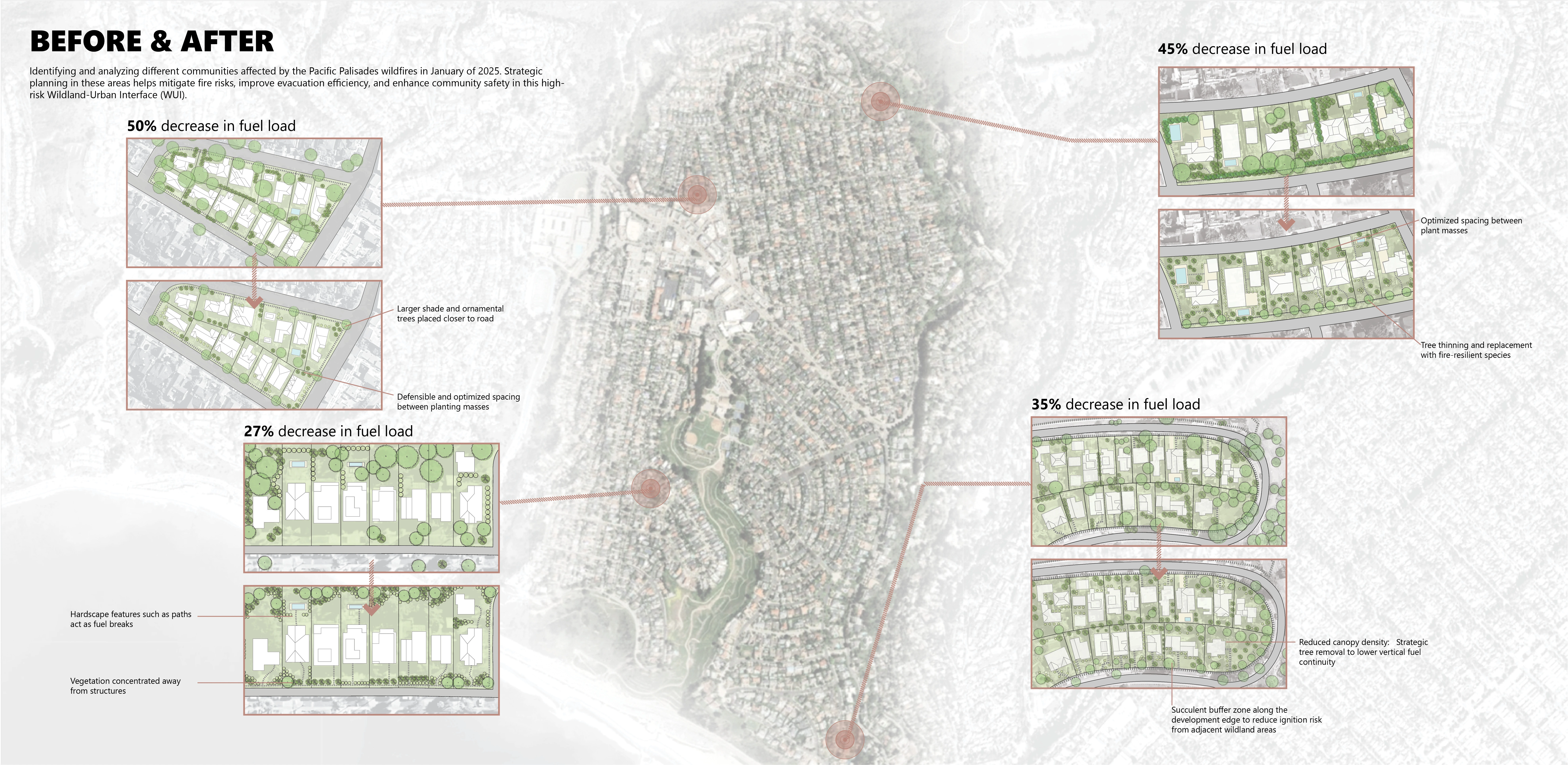This project helps Pacific Palisades homeowners redesign landscapes to be more fire-resilient after the January 2025 wildfire. Grounded in extensive analysis of California’s fire history, vegetation, climate, and residential vulnerabilities, we developed site-specific toolkits and planting palettes tailored to local architecture. The design acknowledges zoning constraints and supports rebuilding on original sites. This work is award-worthy for its timely response to climate-driven disasters, integration of science with design, and its potential to guide resilient rebuilding in fire-prone communities statewide.