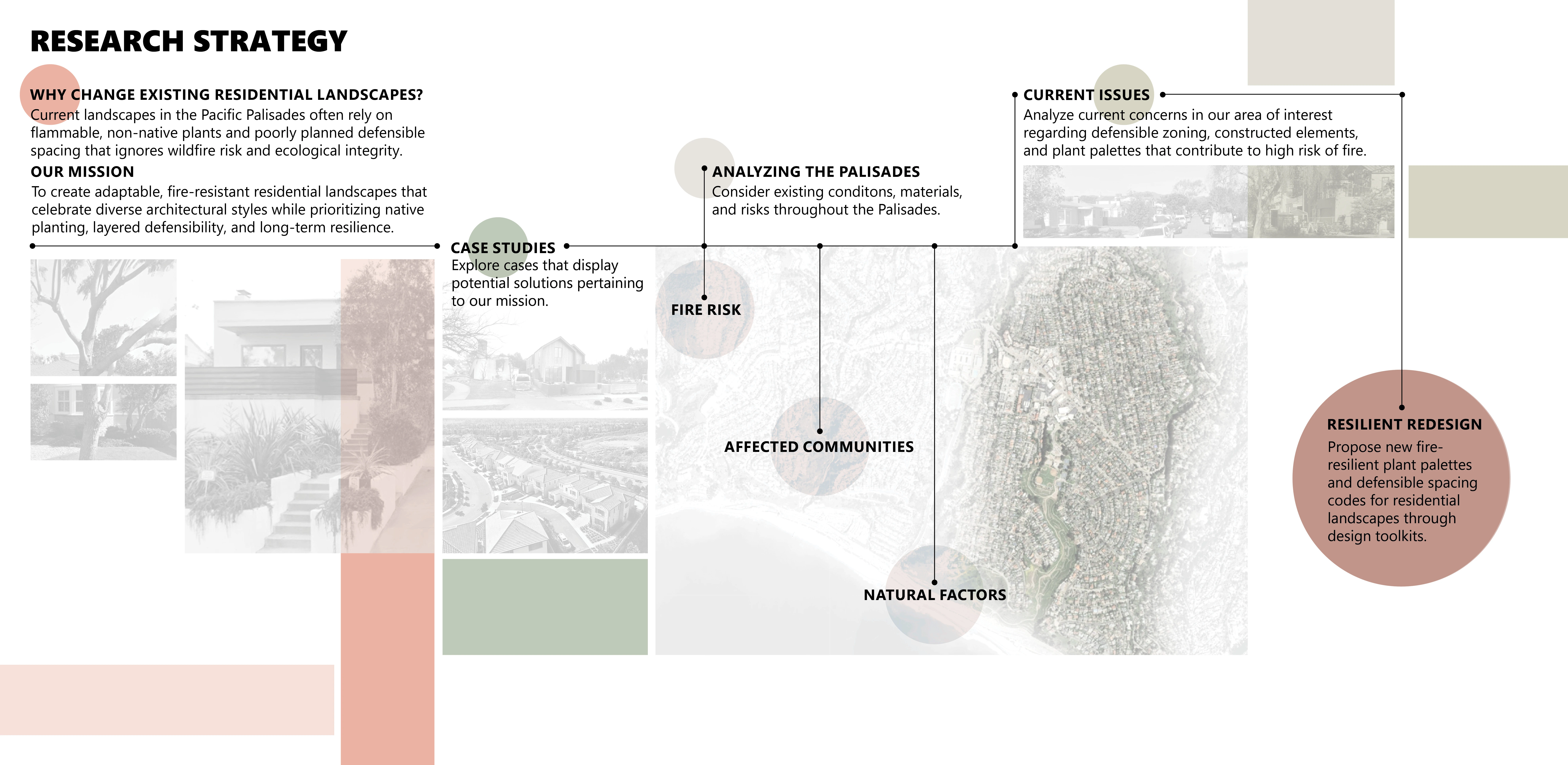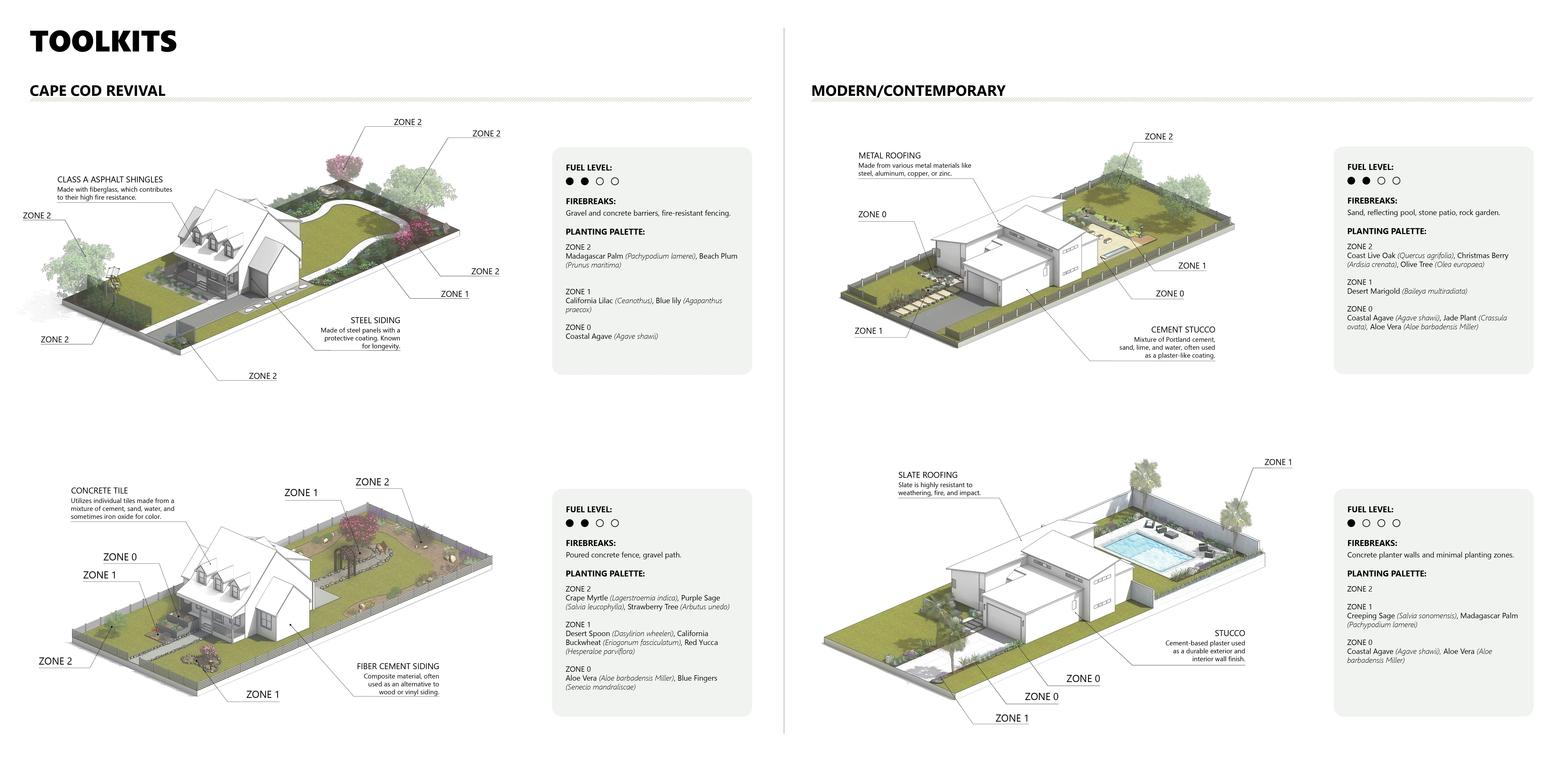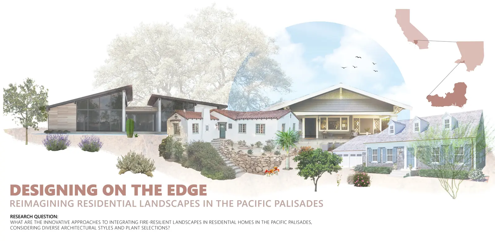 This project addresses the urgent need for resilience in residential landscapes impacted by wildfire, particularly in California where fire is a recurring and intensifying threat. Following the January 2025 wildfire in the Pacific Palisades, our team developed a series of research-driven design toolkits to help homeowners rebuild landscapes that are more fire-adapted, protective, and responsive to the realities of climate change.