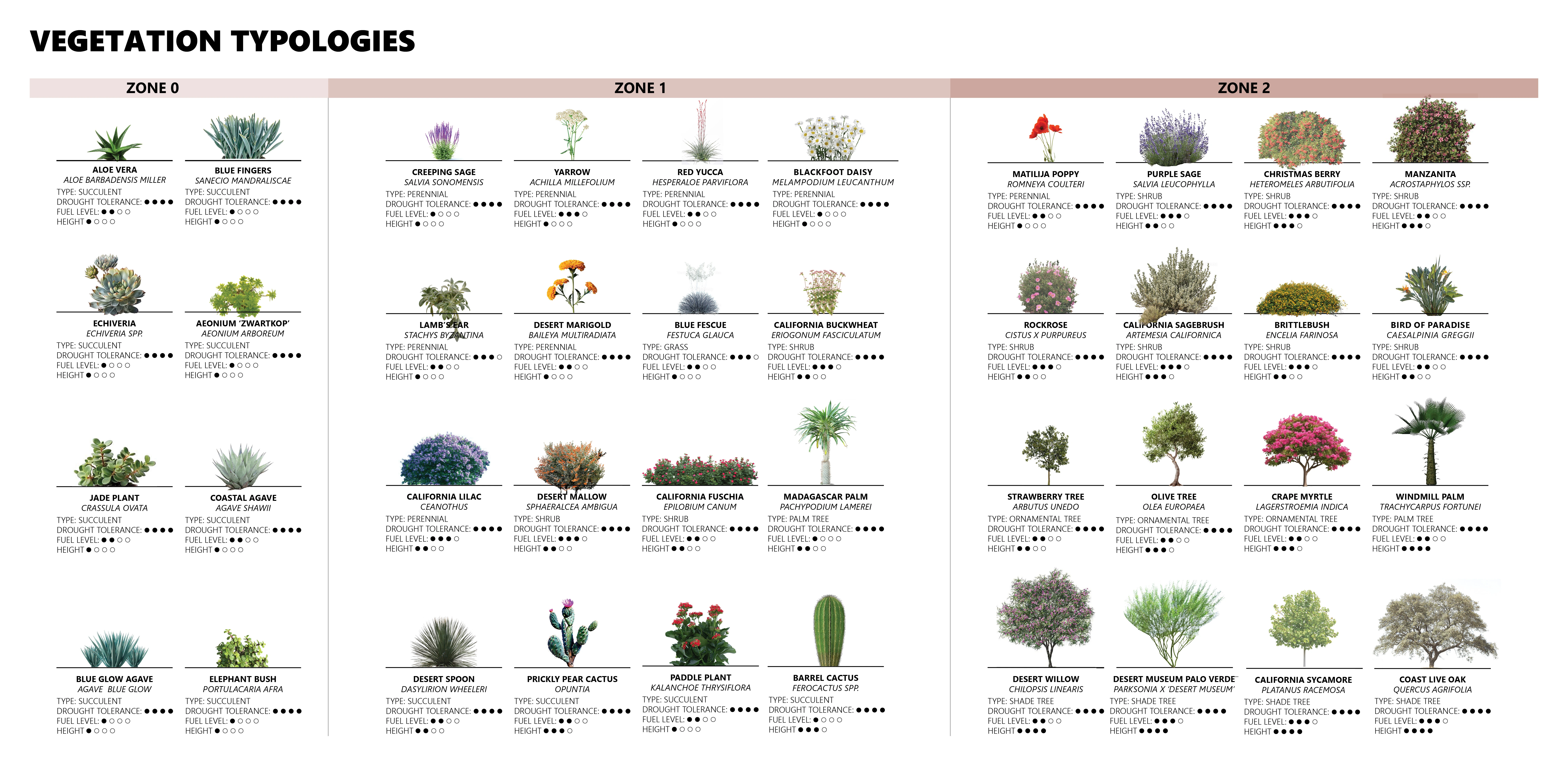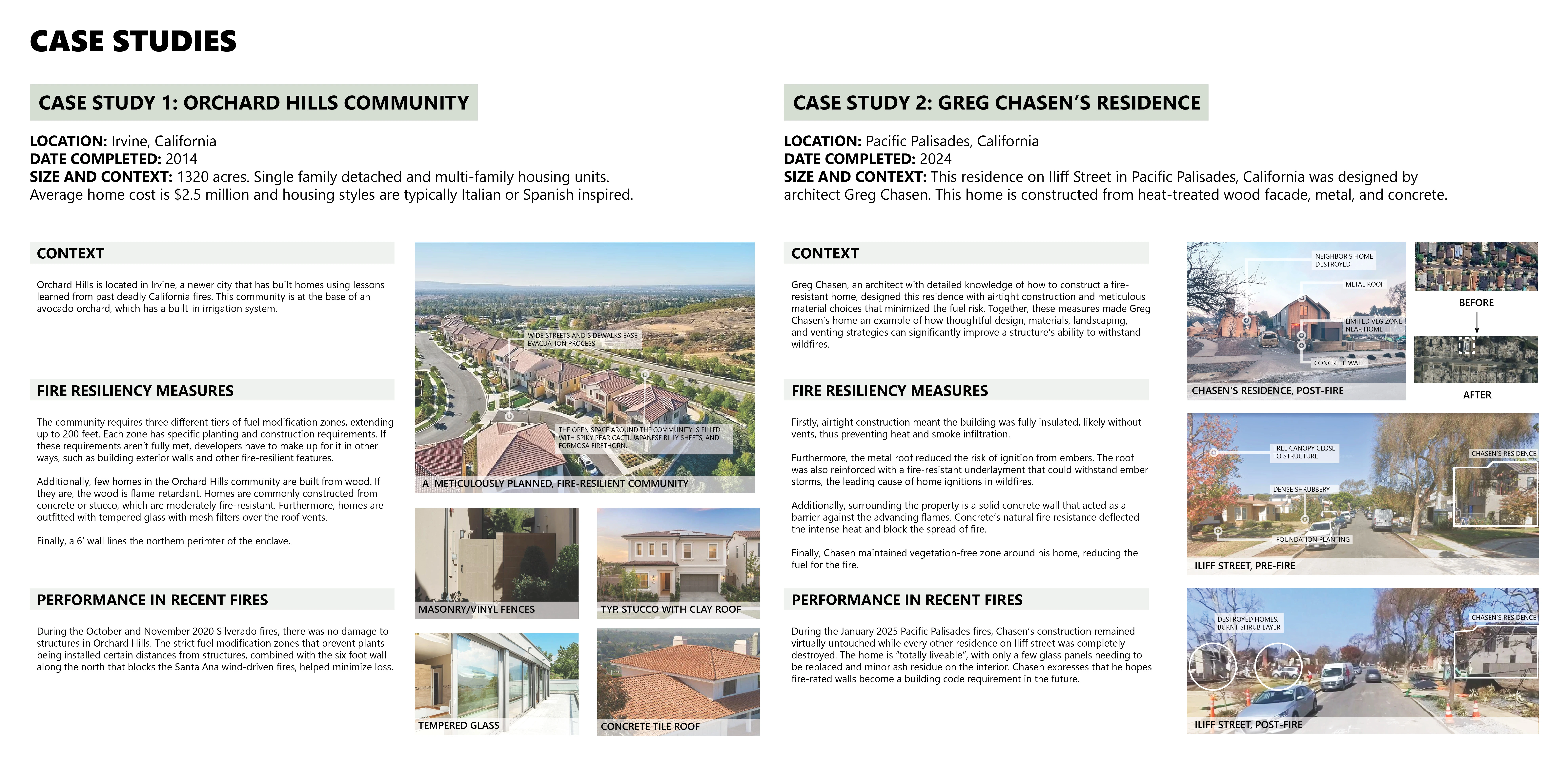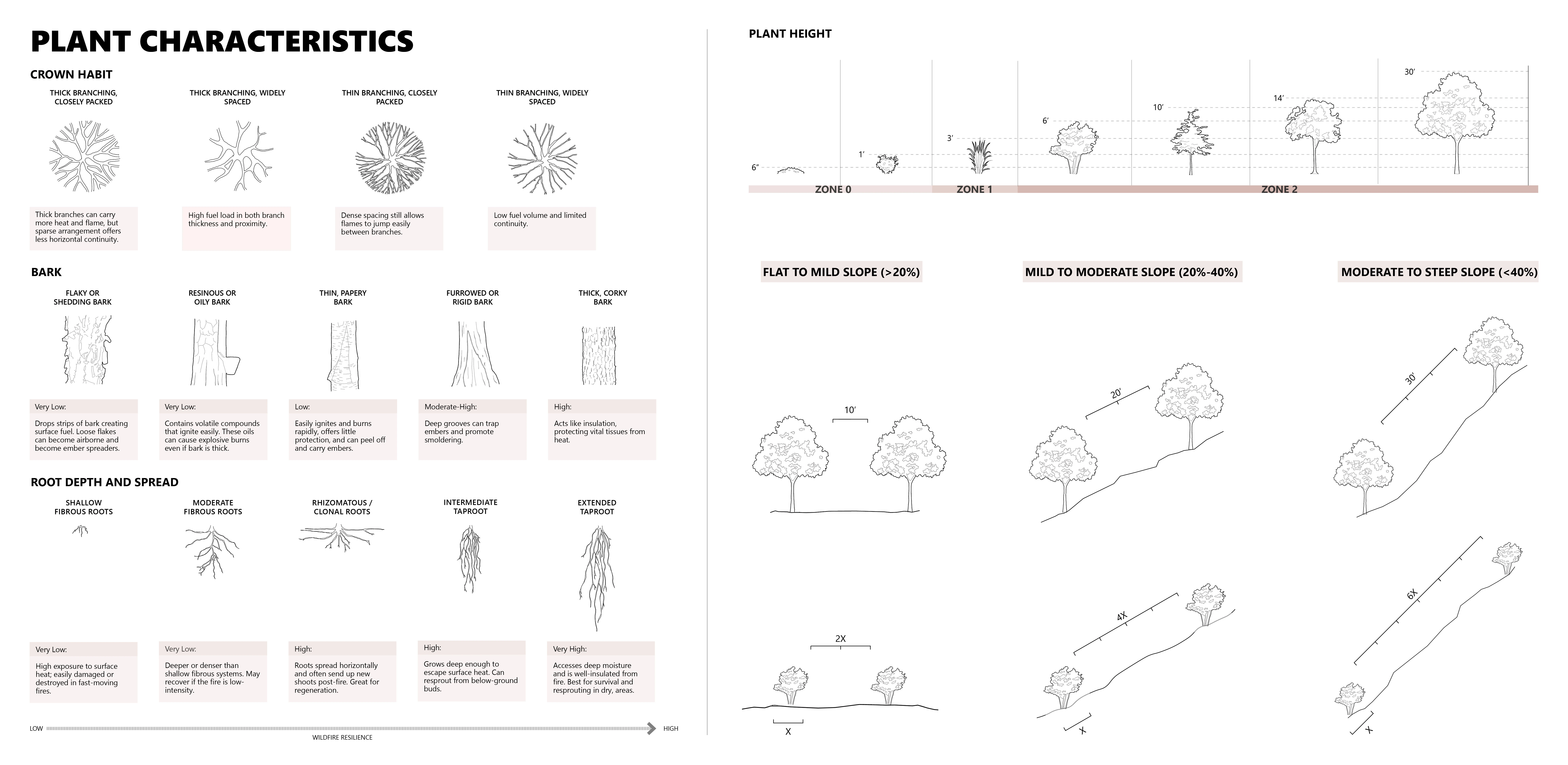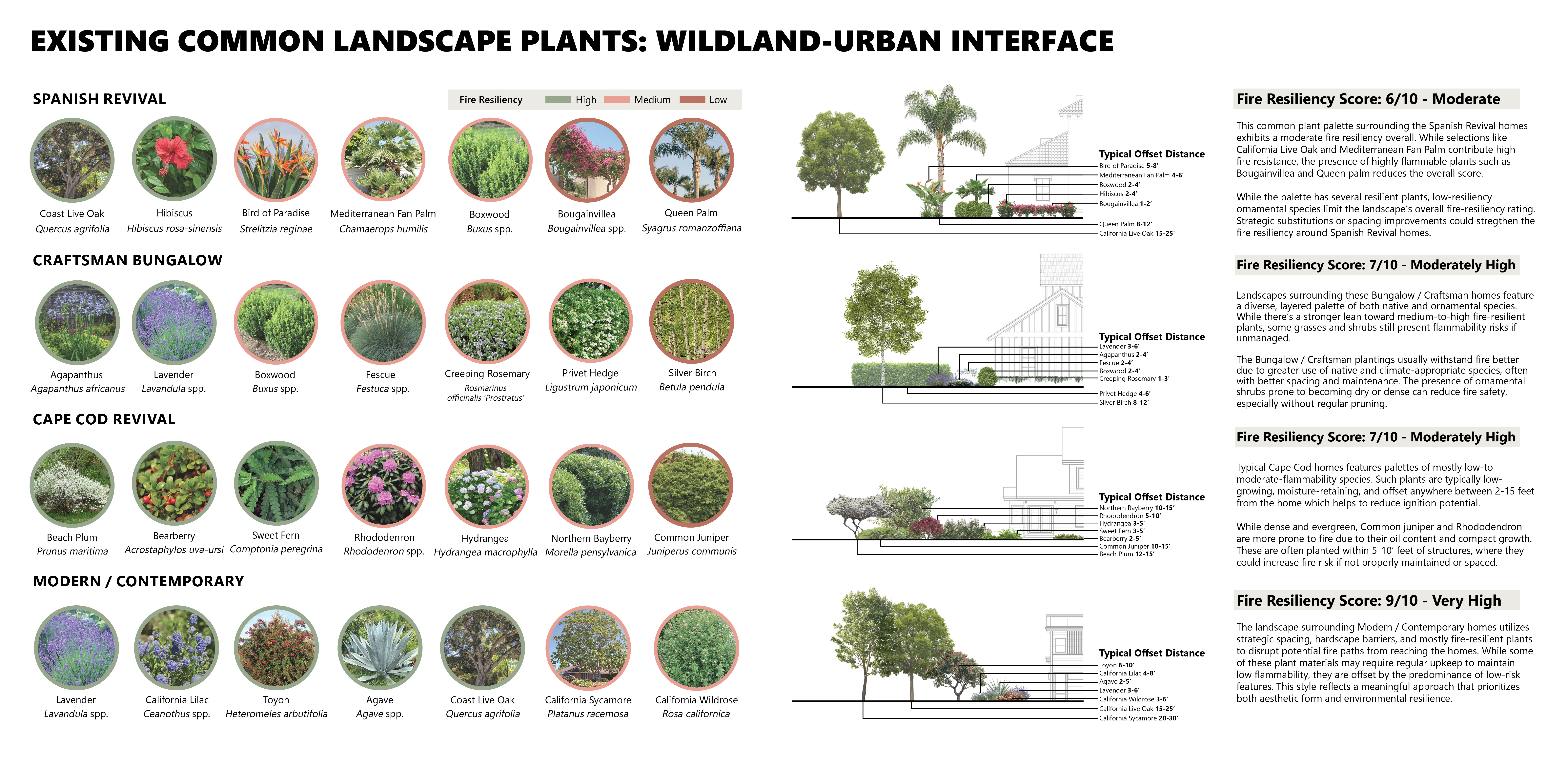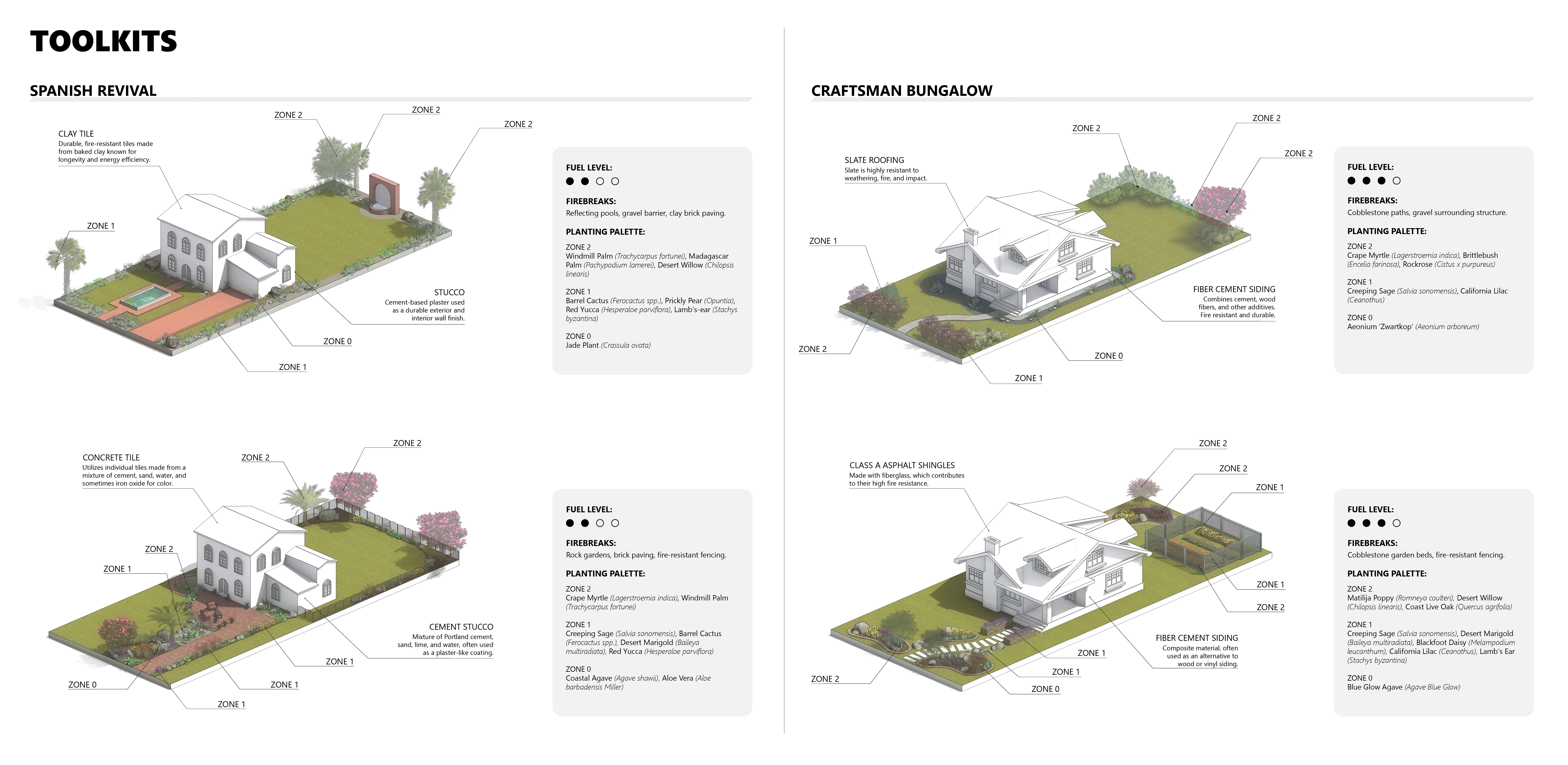 Our toolkits are grounded in a deep analysis of California’s historic fire patterns, vegetation ecology, and climatic conditions, as well as specific site vulnerabilities observed in the 2025 Pacific Palisades fire. We examined why certain residential landscapes burned while others were spared, identifying common design failures such as continuous vegetation, flammable plant species, and the absence of defensible space. We then translated these findings into actionable design strategies.