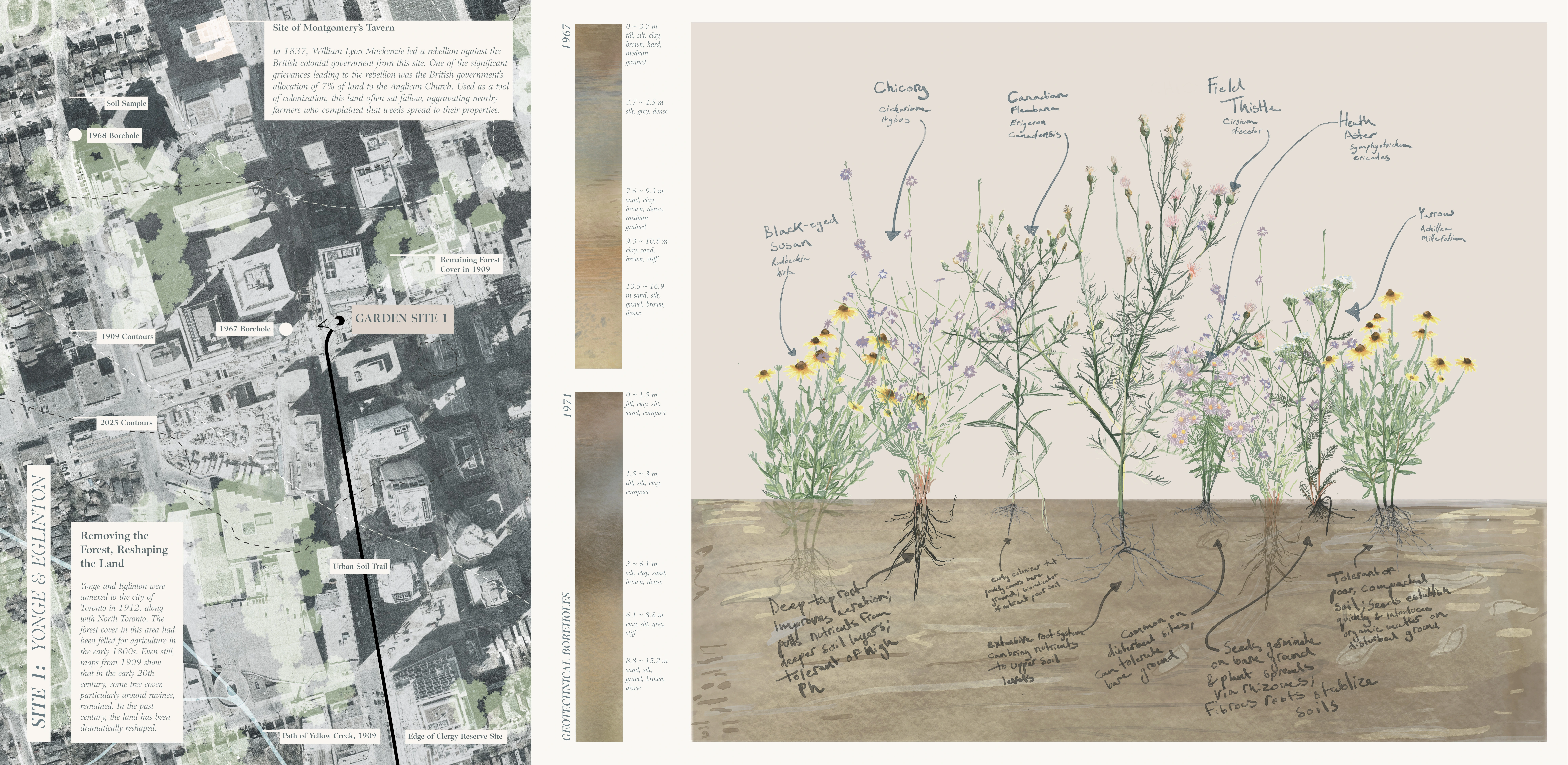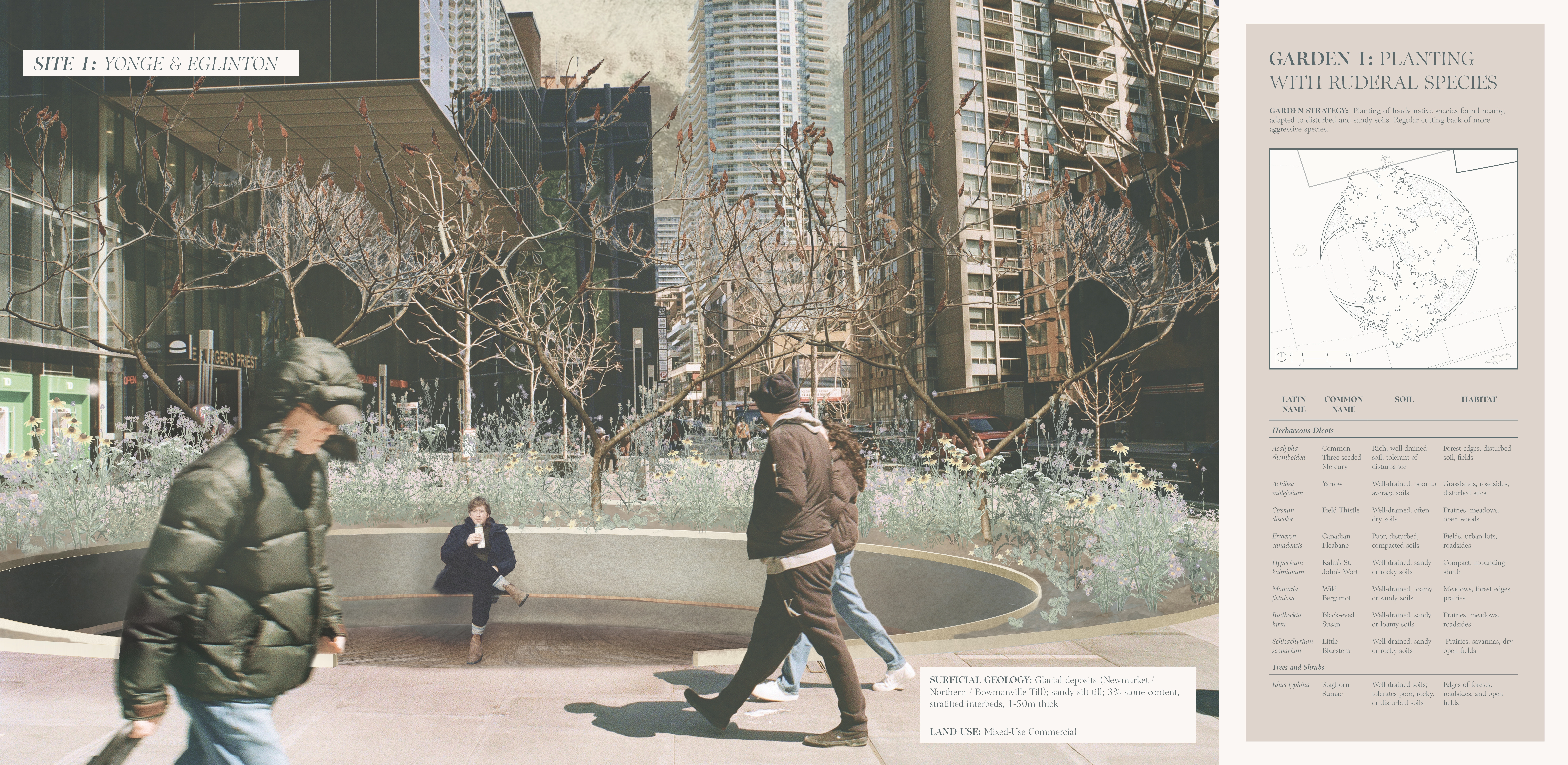 Site 1: Yonge and Eglinton – A dense mixed-use area and one of Toronto's Central Business Districts. On this site, ruderal species that can withstand harsh urban conditions will be planted in a manner that reframes their aesthetic interest.