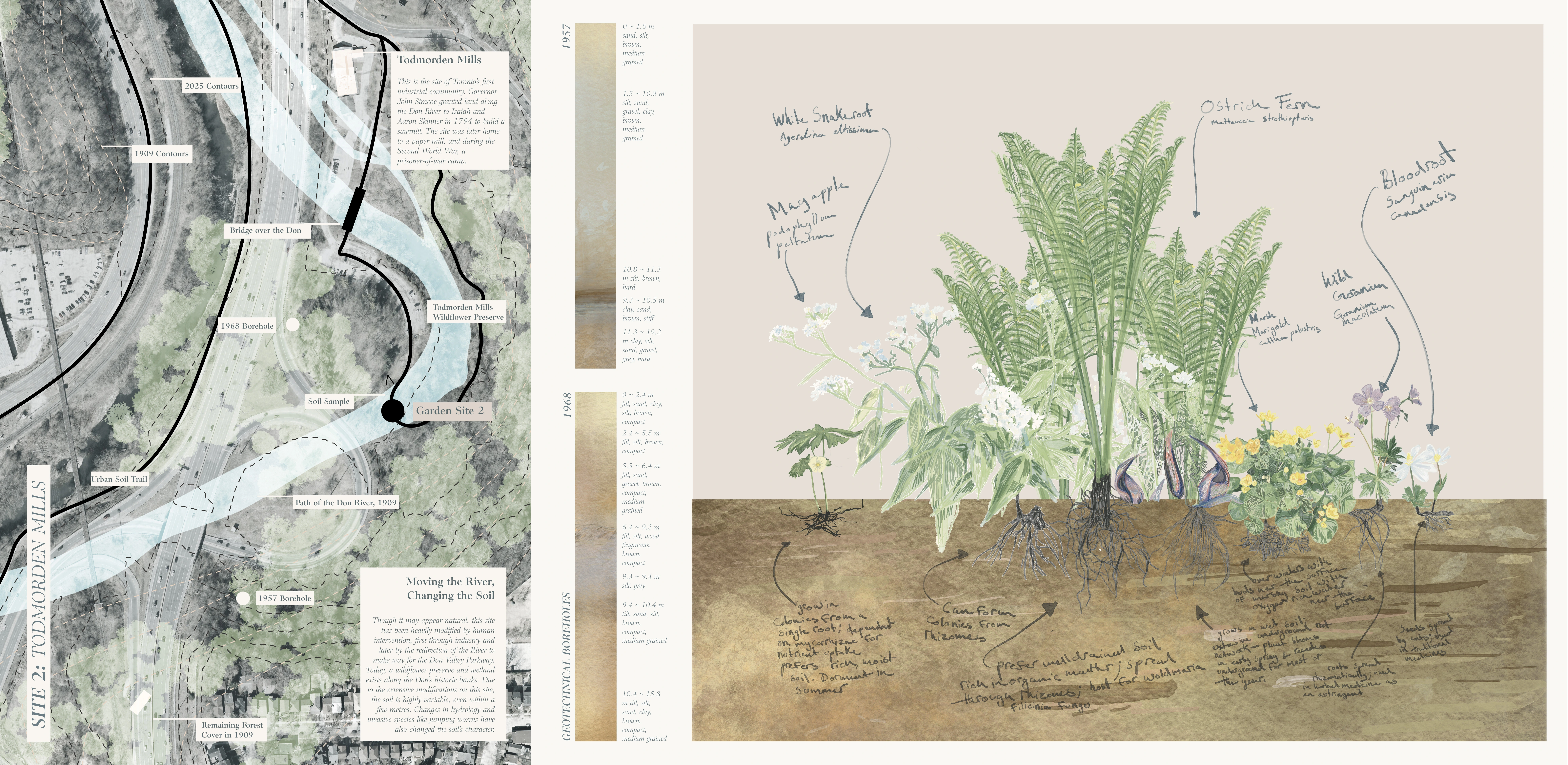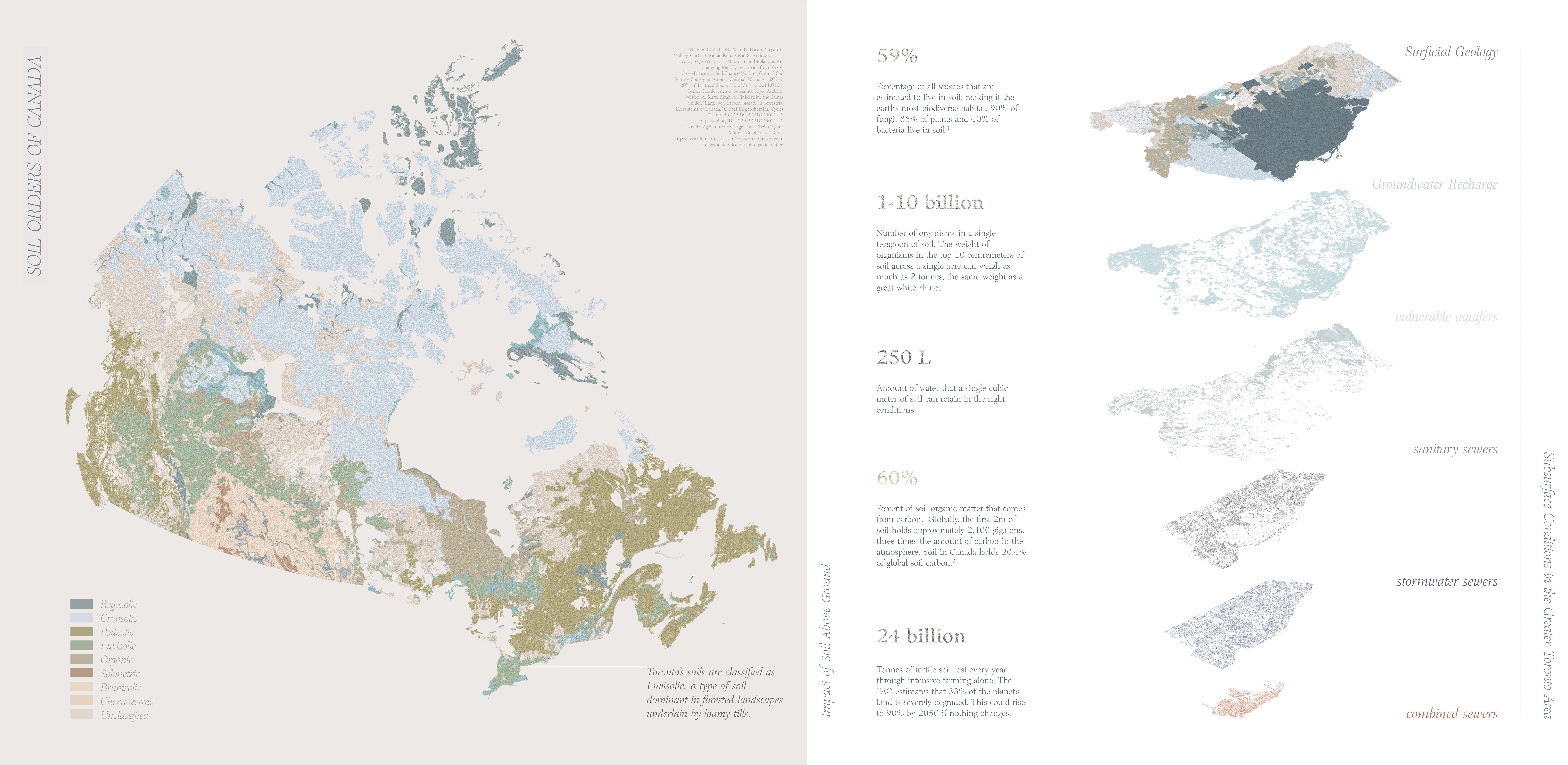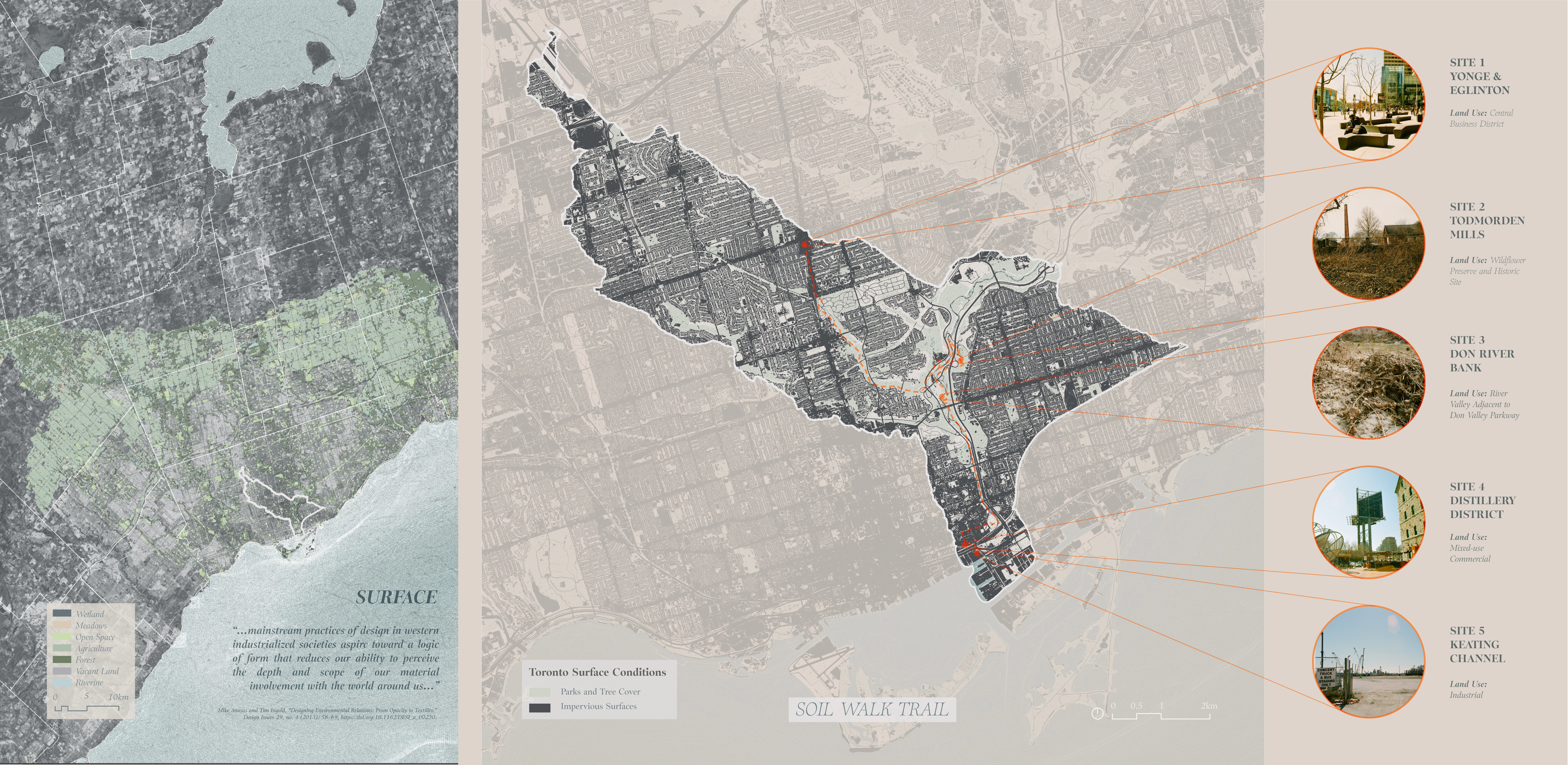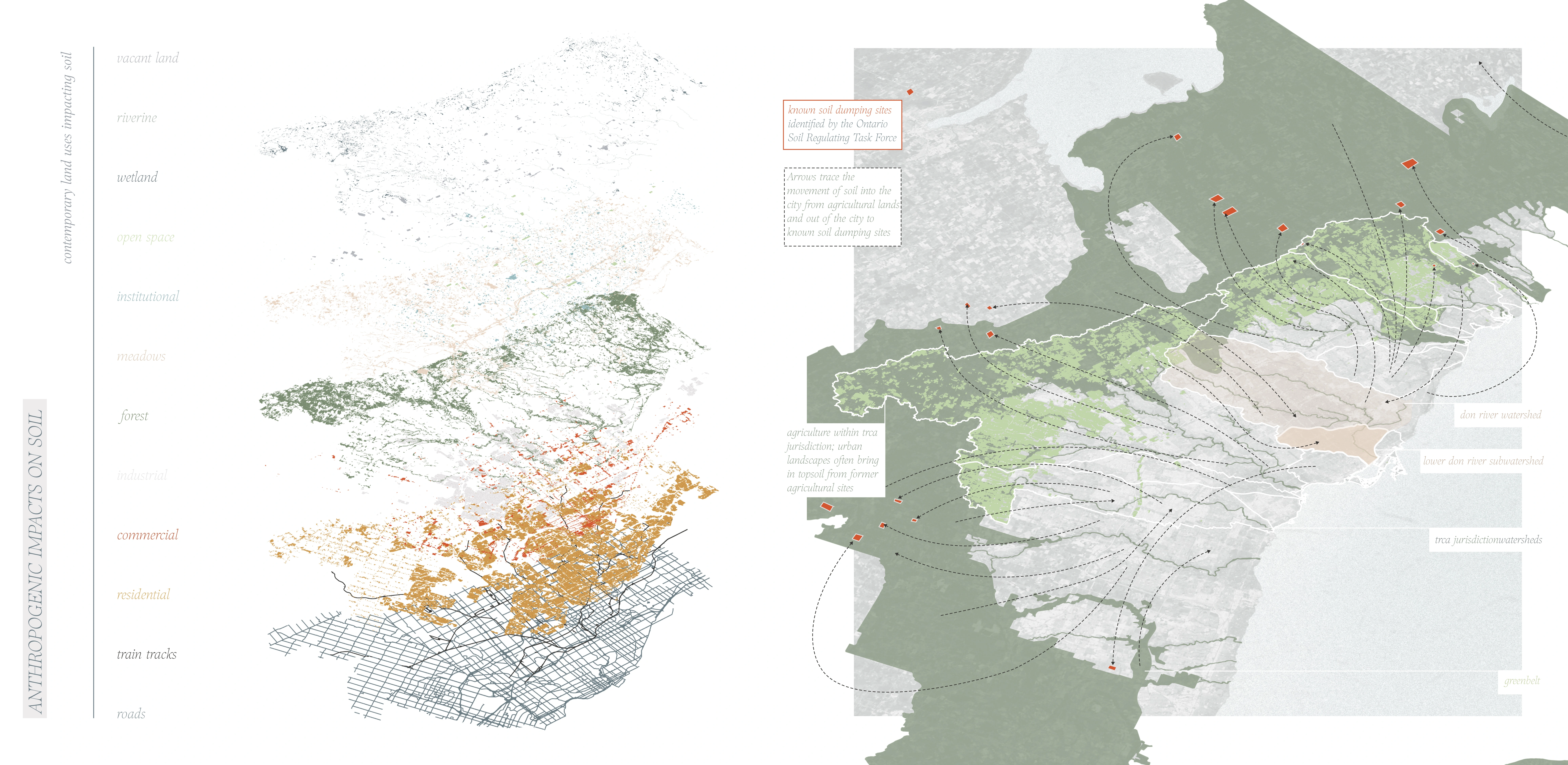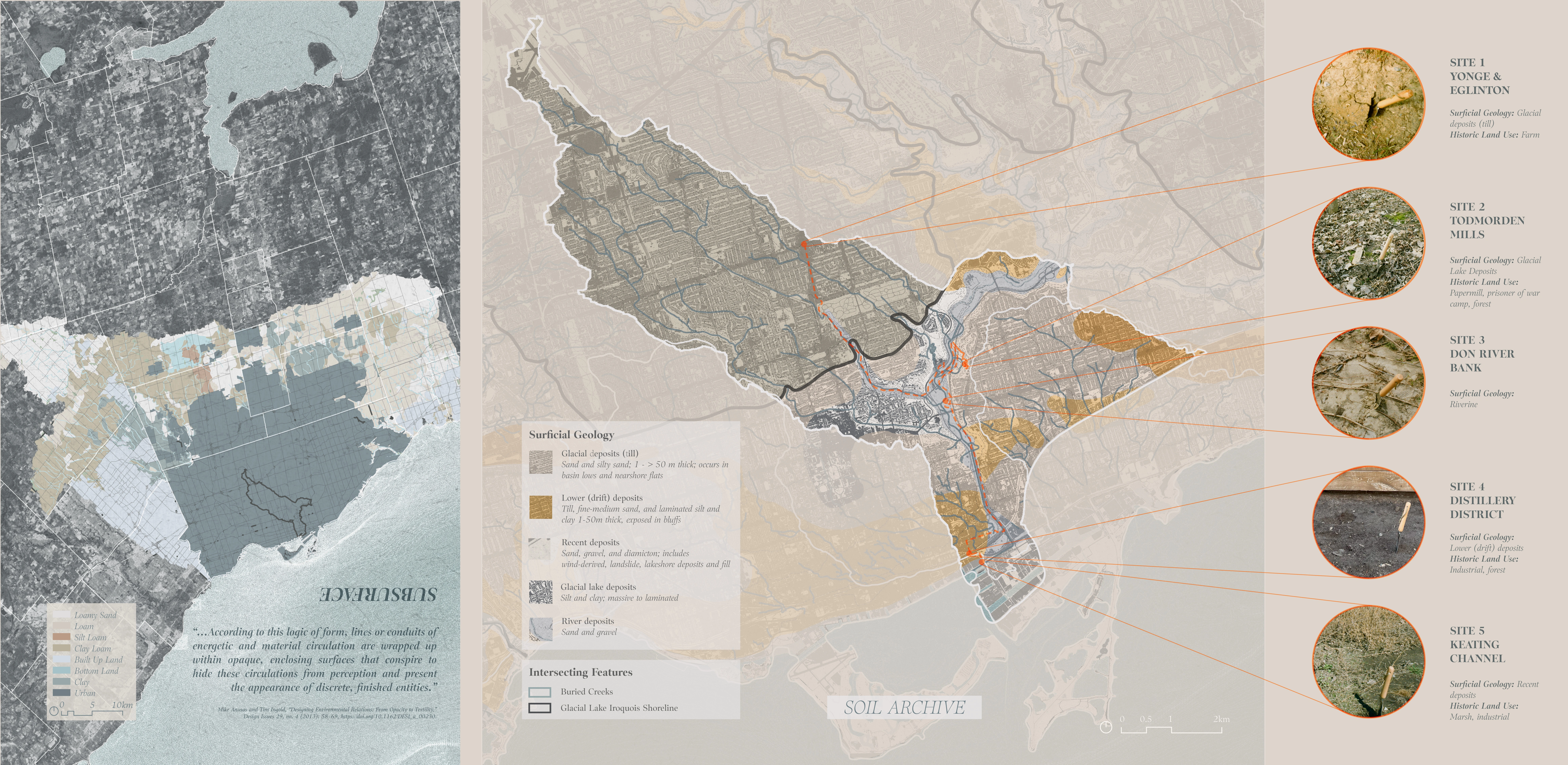 Urban soils reflect life in cities. Though often considered opaque, obscure, or degraded beyond value, they are complex systems that hold the residual impact of human activity over time. Using Toronto’s Lower Don River Sub-watershed as a case study, this project asks: