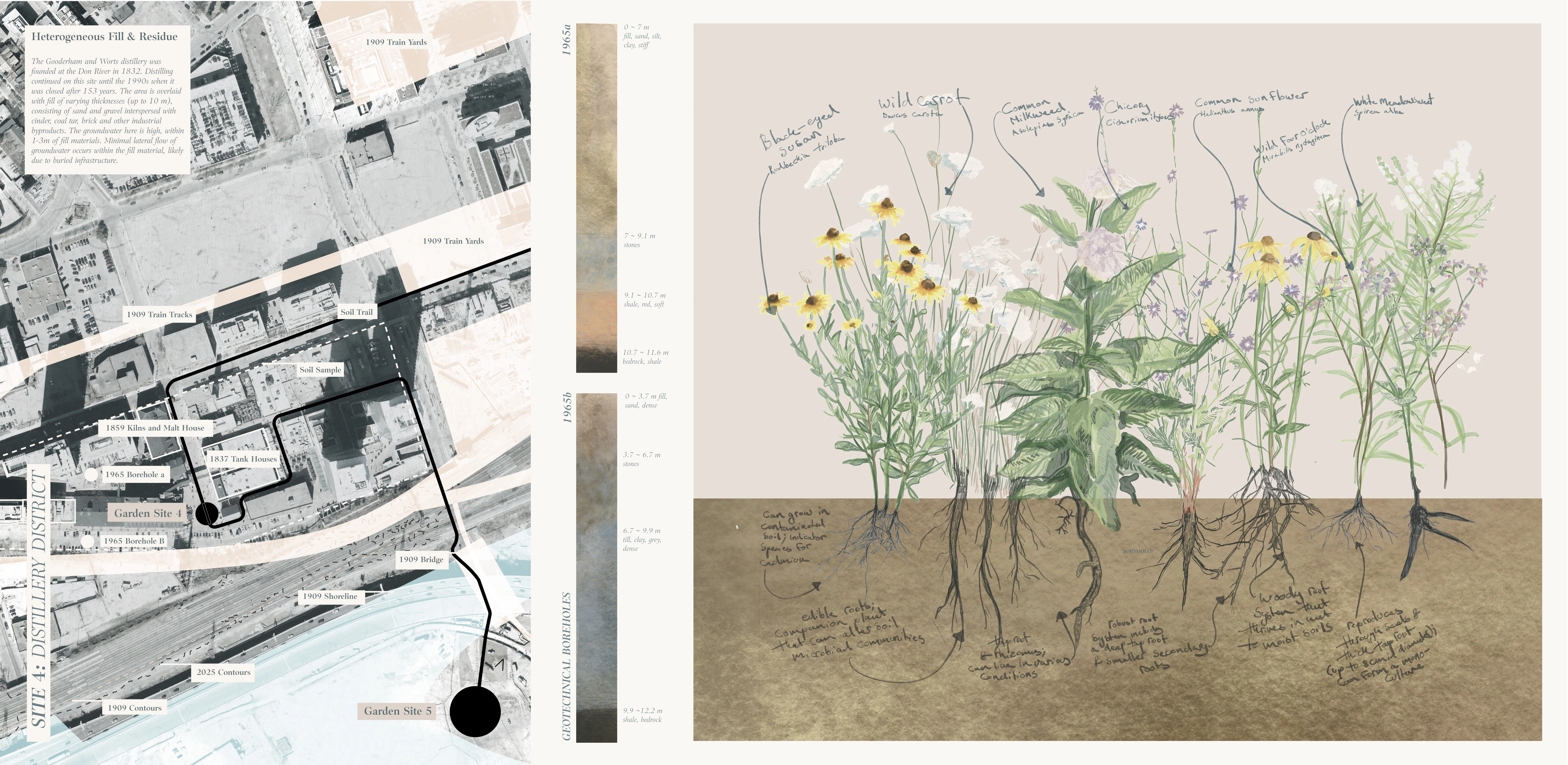 Site 4: Distillery District – A mixed-use heritage district near the downtown core. On this site, a circular clearing will be split by a sunken path: one half will be planted with ruderal species tolerant of dense urban environments, clay-heavy soil, and a high-water table; the other half will be left bare for natural succession to occur.