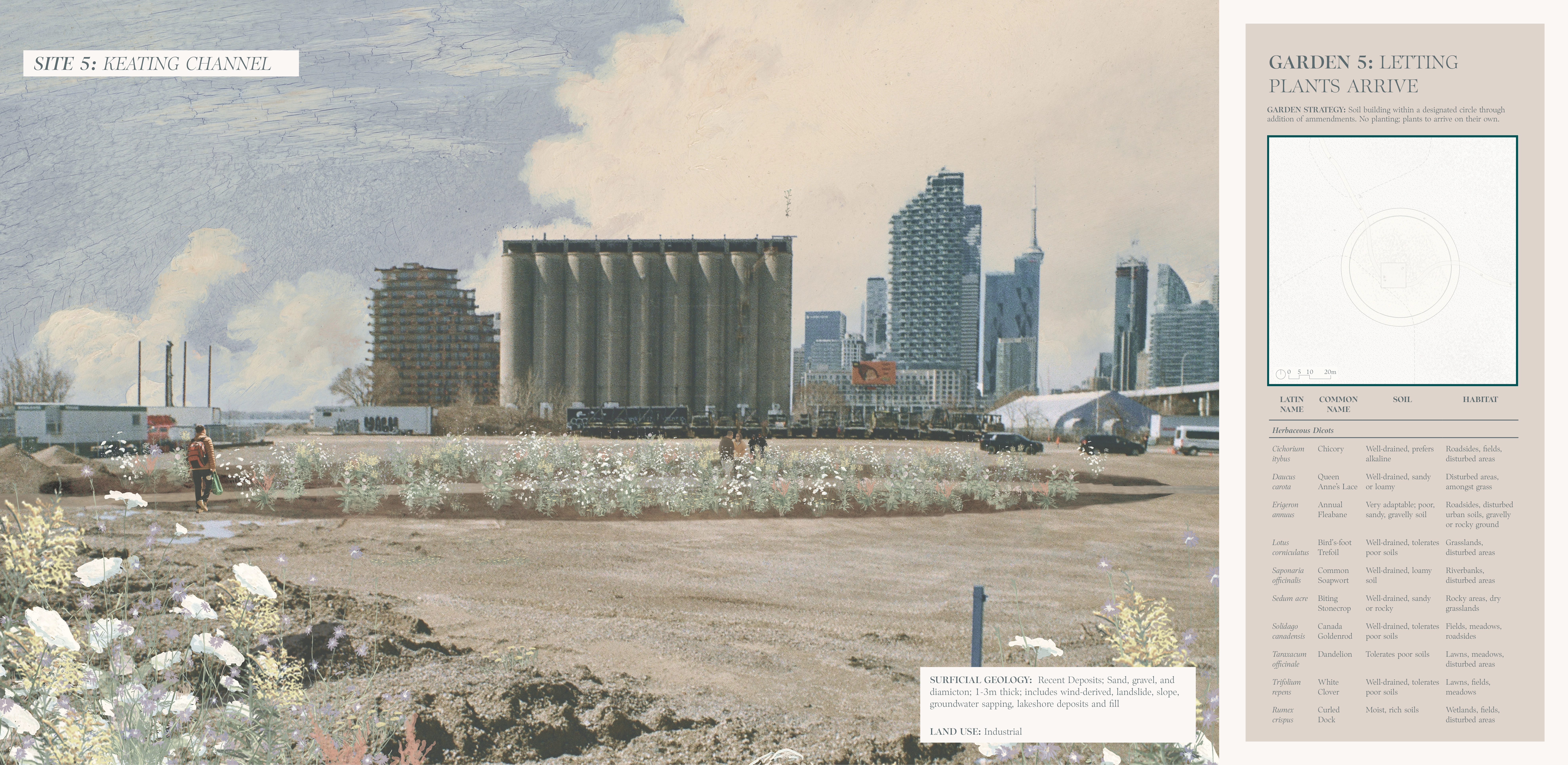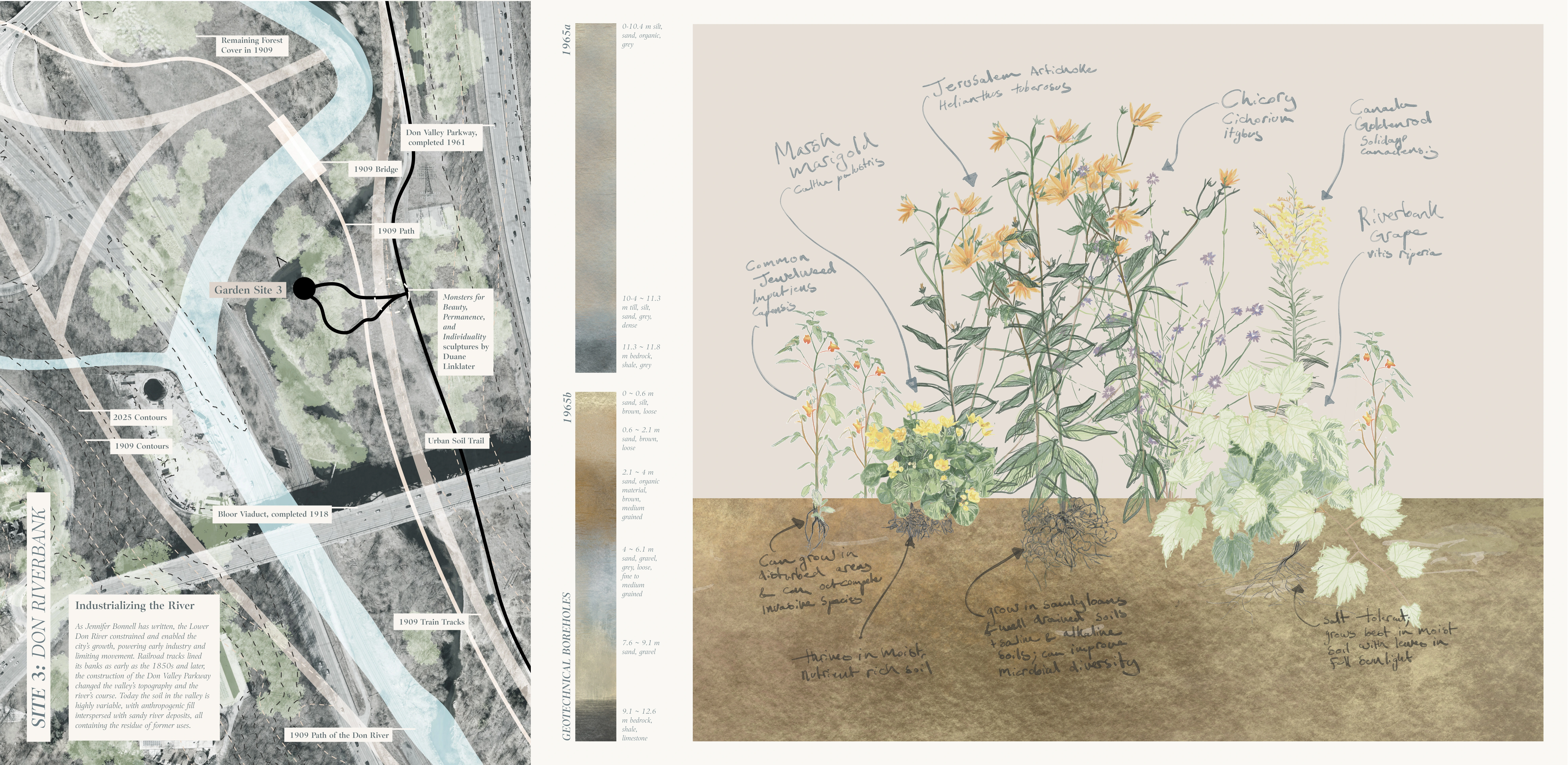 To promote soil literacy, this project proposes an urban soil survey and a series of experimental gardens along a 10-kilometer trail in Toronto’s Lower Don Valley Sub-watershed. These gardens integrate varying degrees of intervention with one rule: no new soil can be added. Instead, existing urban soil conditions are explored through collaborations with plant life.