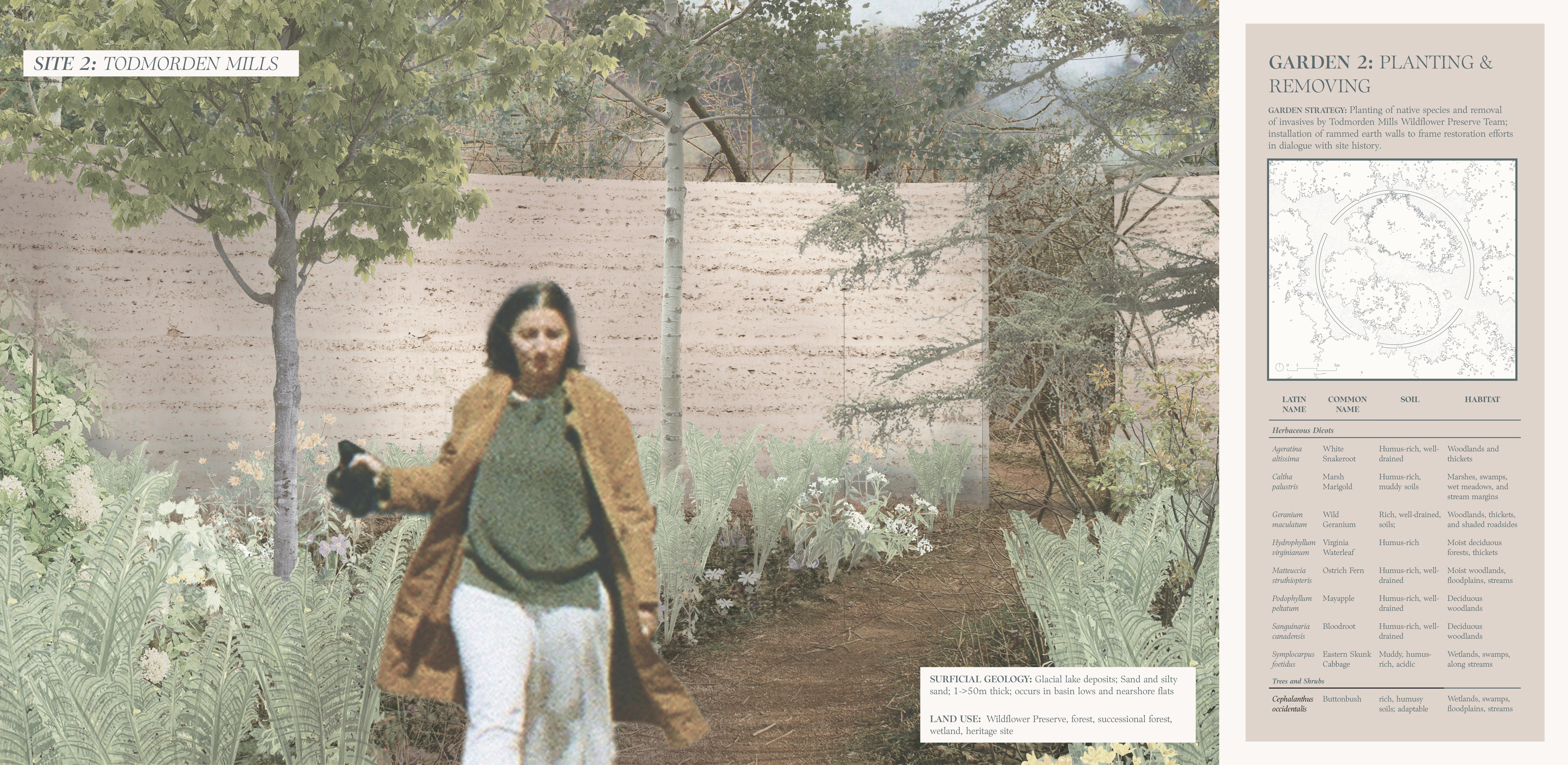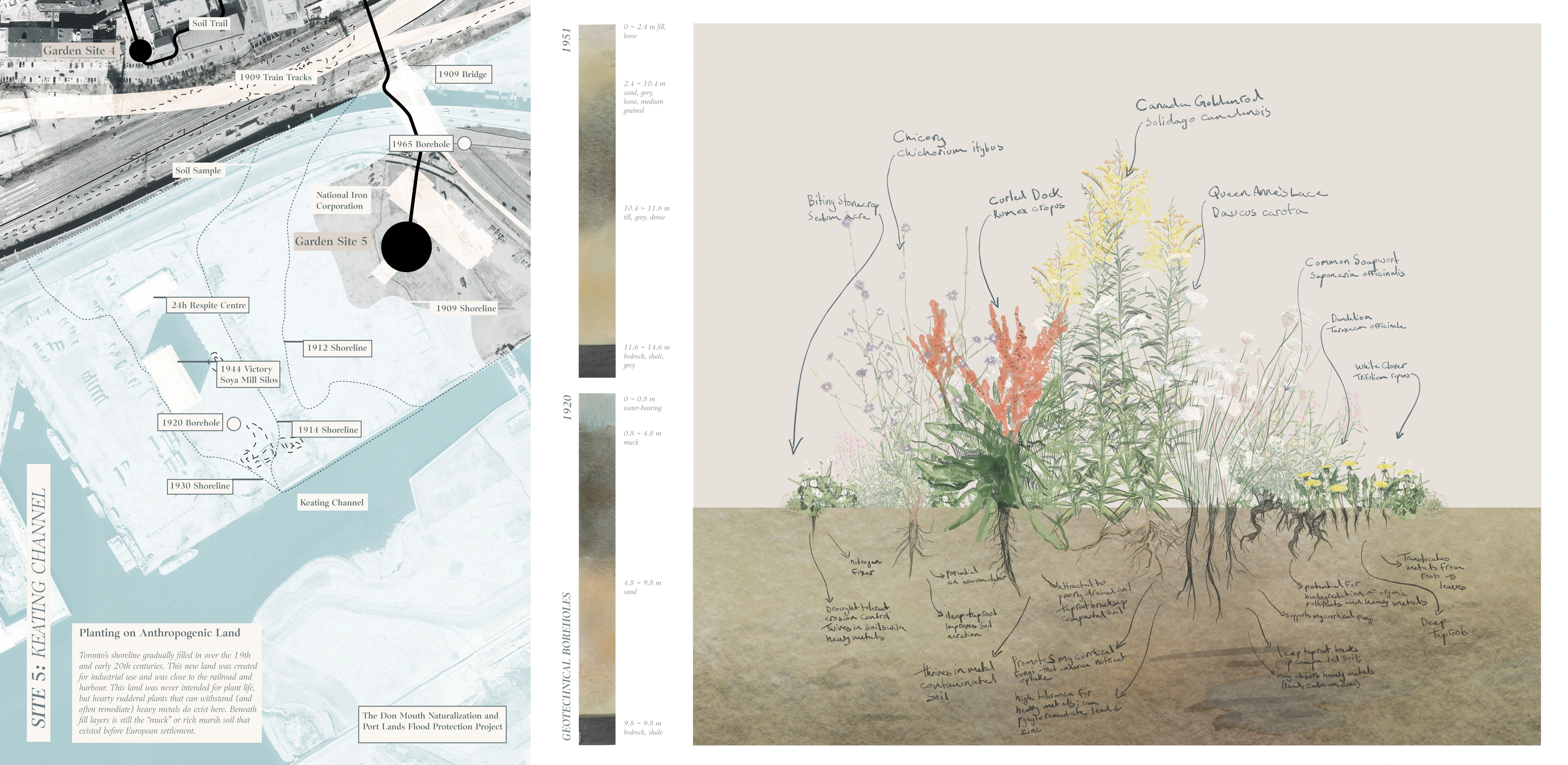 To build and maintain healthy urban soils we must first build soil literacy. This project proposes an urban soil survey, and a series of experimental gardens designed to communicate soil survey findings along a 10-kilometer trail in Toronto’s Lower Don Valley Sub-watershed. Each garden begins with a simple rule: no new soil can be added. Instead, plants become intermediaries that convey below-ground conditions. These gardens are intended to be inter-species collaborations with varying degrees of human intervention, from full planting plans and ongoing maintenance schemes to gardens where successional processes are allowed to occur over time and only edges are maintained. In each garden, installation methods are low impact, prioritizing on-site materials and passive interventions.