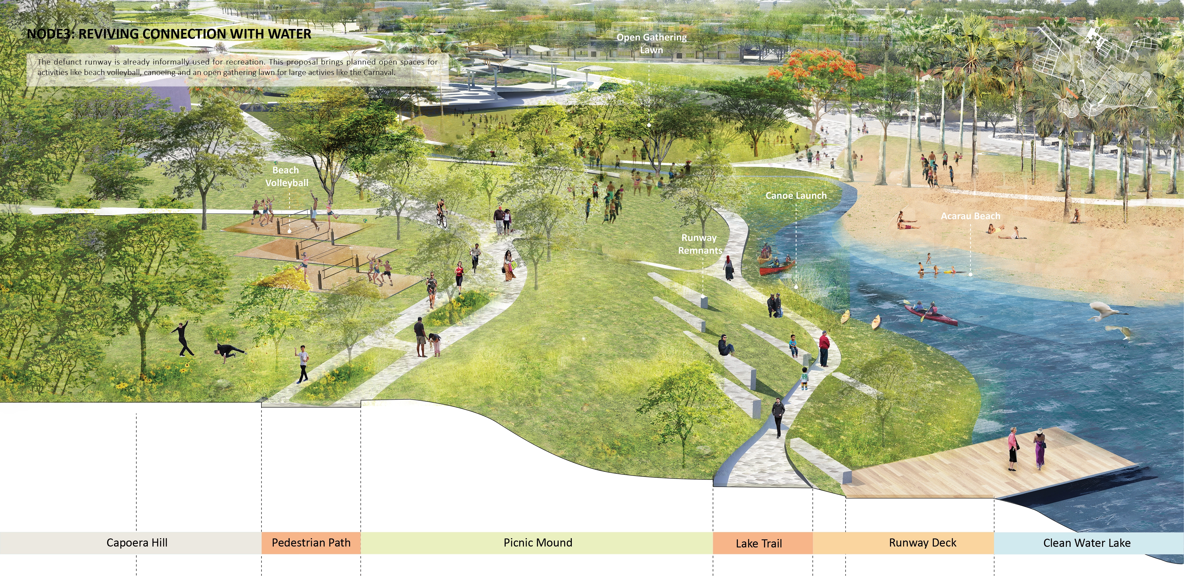 Acaraú once stood as a vibrant cultural anchor, bustling with social activities, including canoeing. In recent years, however, these traditions have diminished due to various factors, including environmental degradation and urban development. This node, situated at the confluence of the filtered water creek and the Acaraú River, aims to revive active recreation by reintroducing canoeing and river bathing; culturally significant practices that have faded over time.