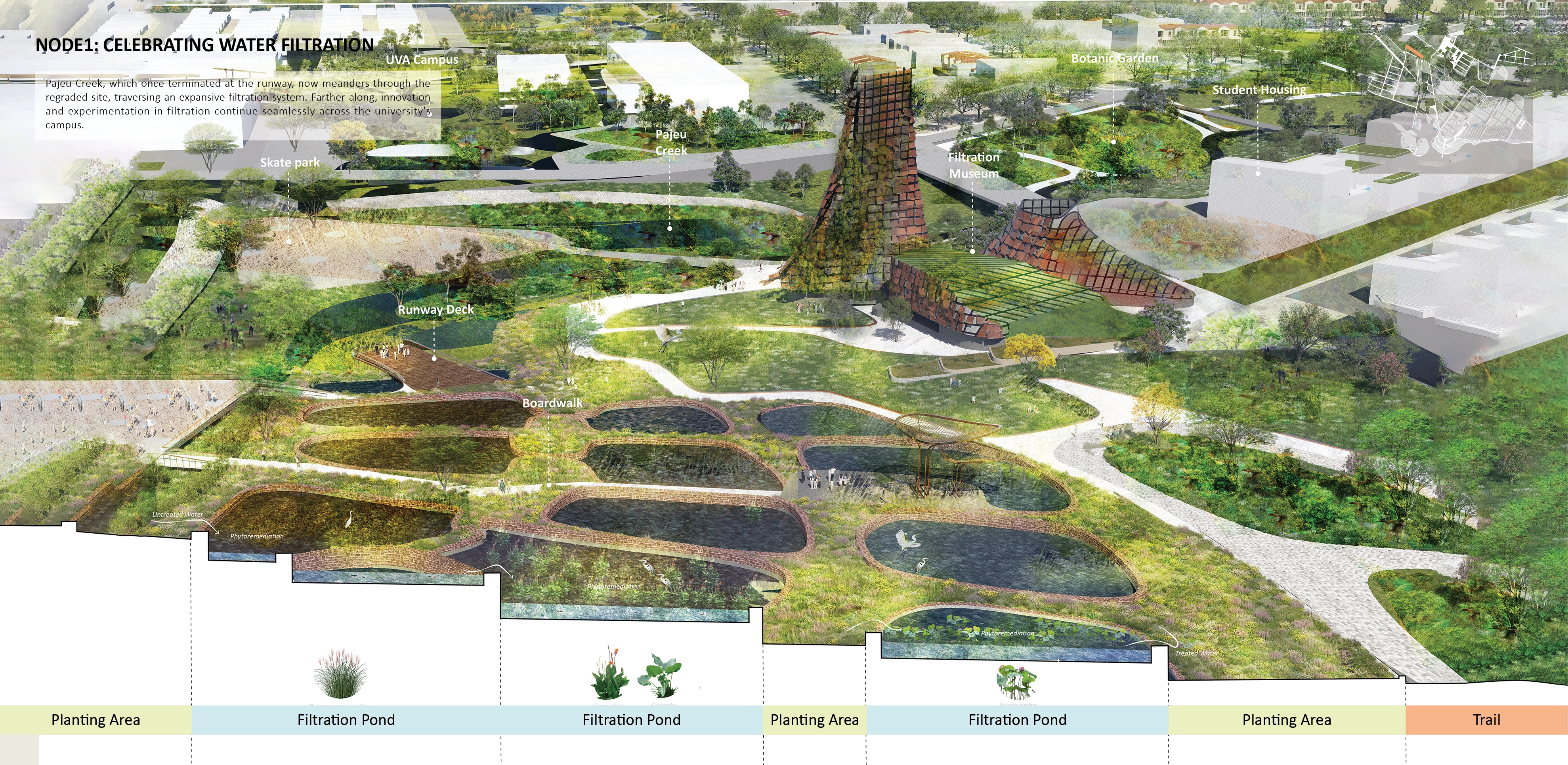 Strategically positioned near the UVA campus, the first node celebrates natural water filtration techniques. This water museum serves as a civic hub, engaging the community and leveraging the city's strong educational resources. Pajeu Creek, which once terminated at the runway, now meanders through the regraded site, traversing an expansive filtration system.