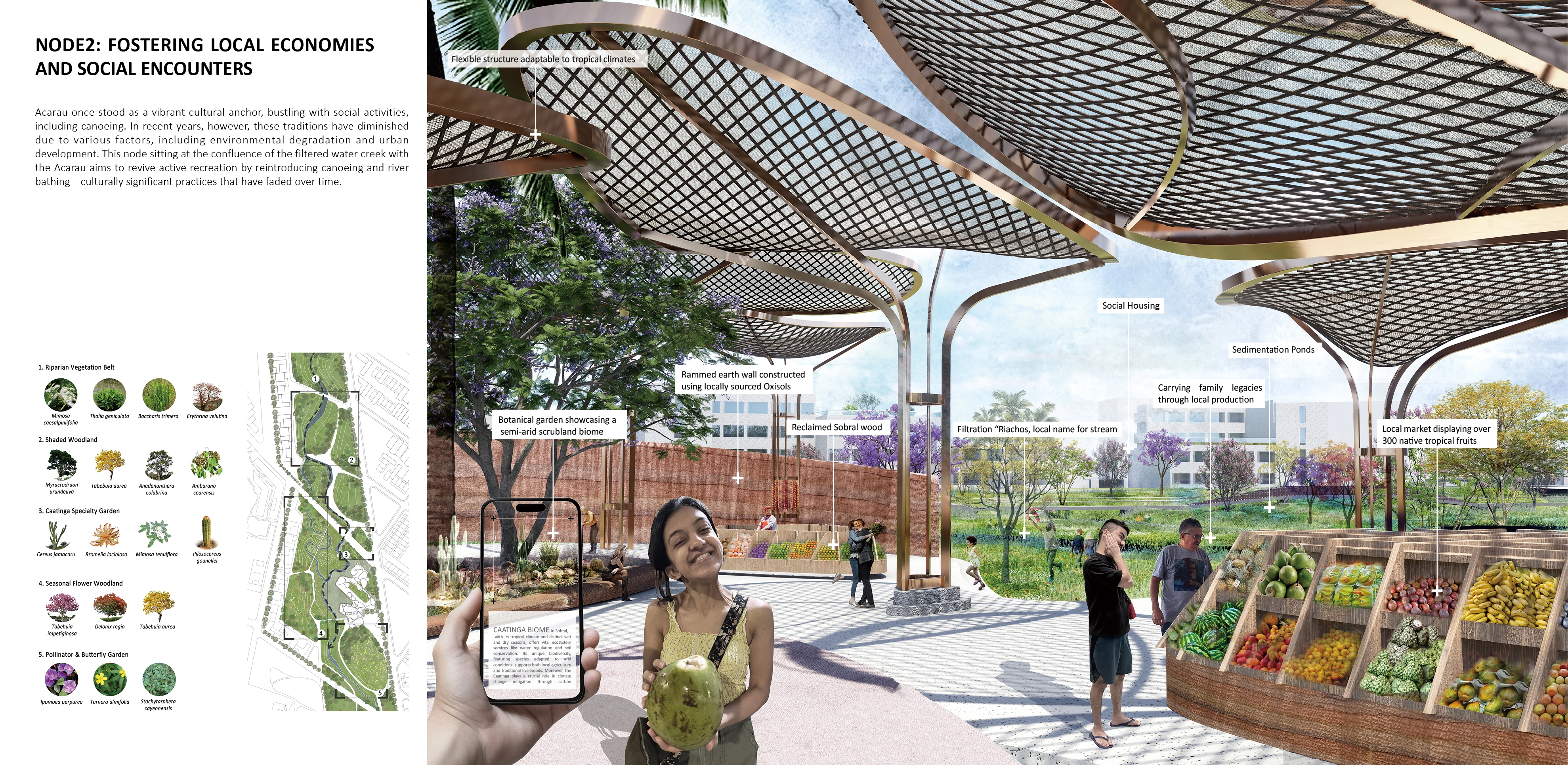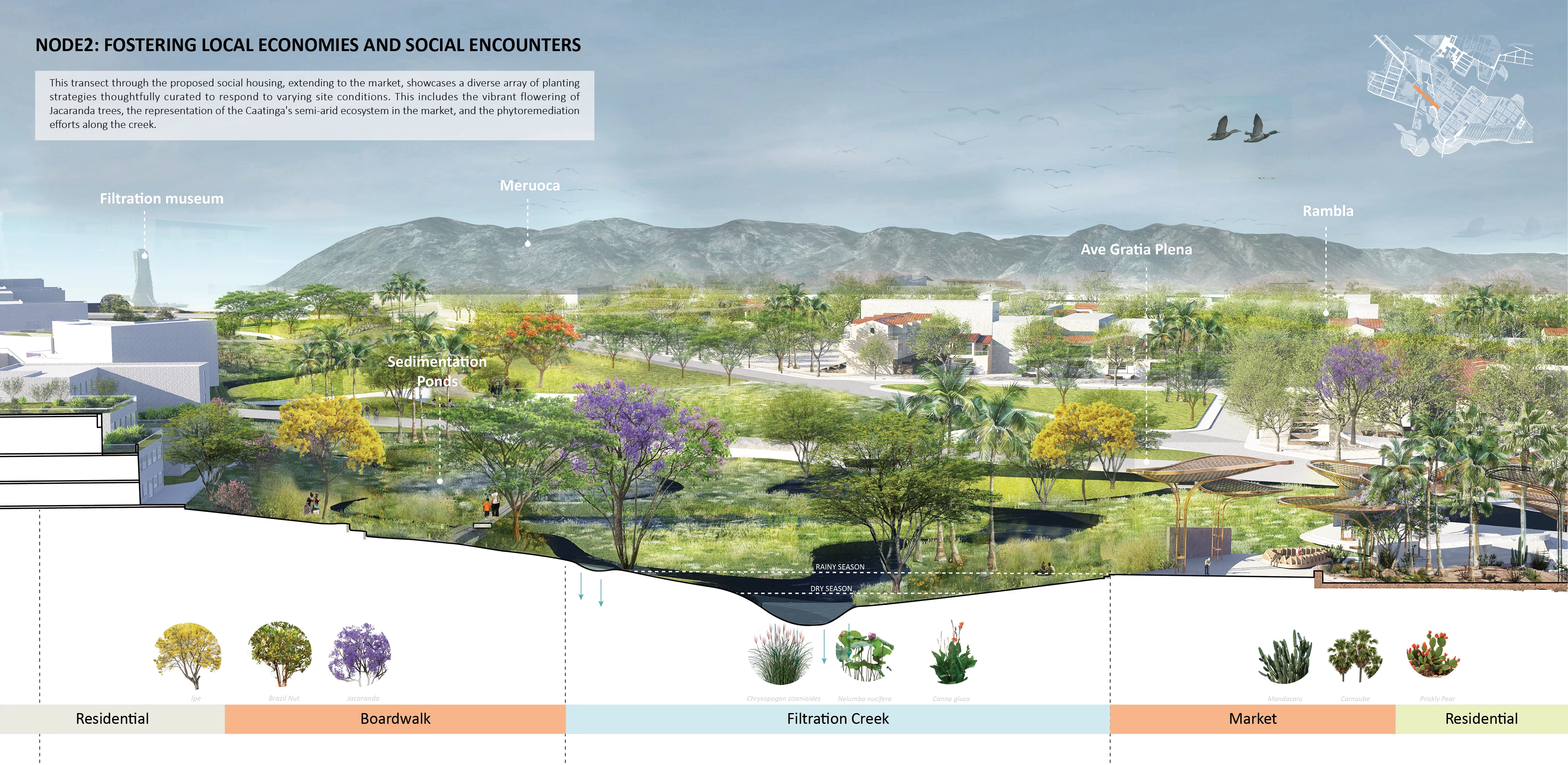 At the heart of our design lies a commitment to water filtration and ecological restoration responding to the city's distraught relationship with sewage water treatment and urban flooding. The project aims to reconnect the blue system—from the existing Filtration Gardens (the city's pilot natural filtration project) to the downstream Acaraú River—while embracing landscape as a pedagogical tool for environmental awareness and community engagement. Water management strategies showcase the region's diverse habitats, integrating ecological approaches to landscape remediation.