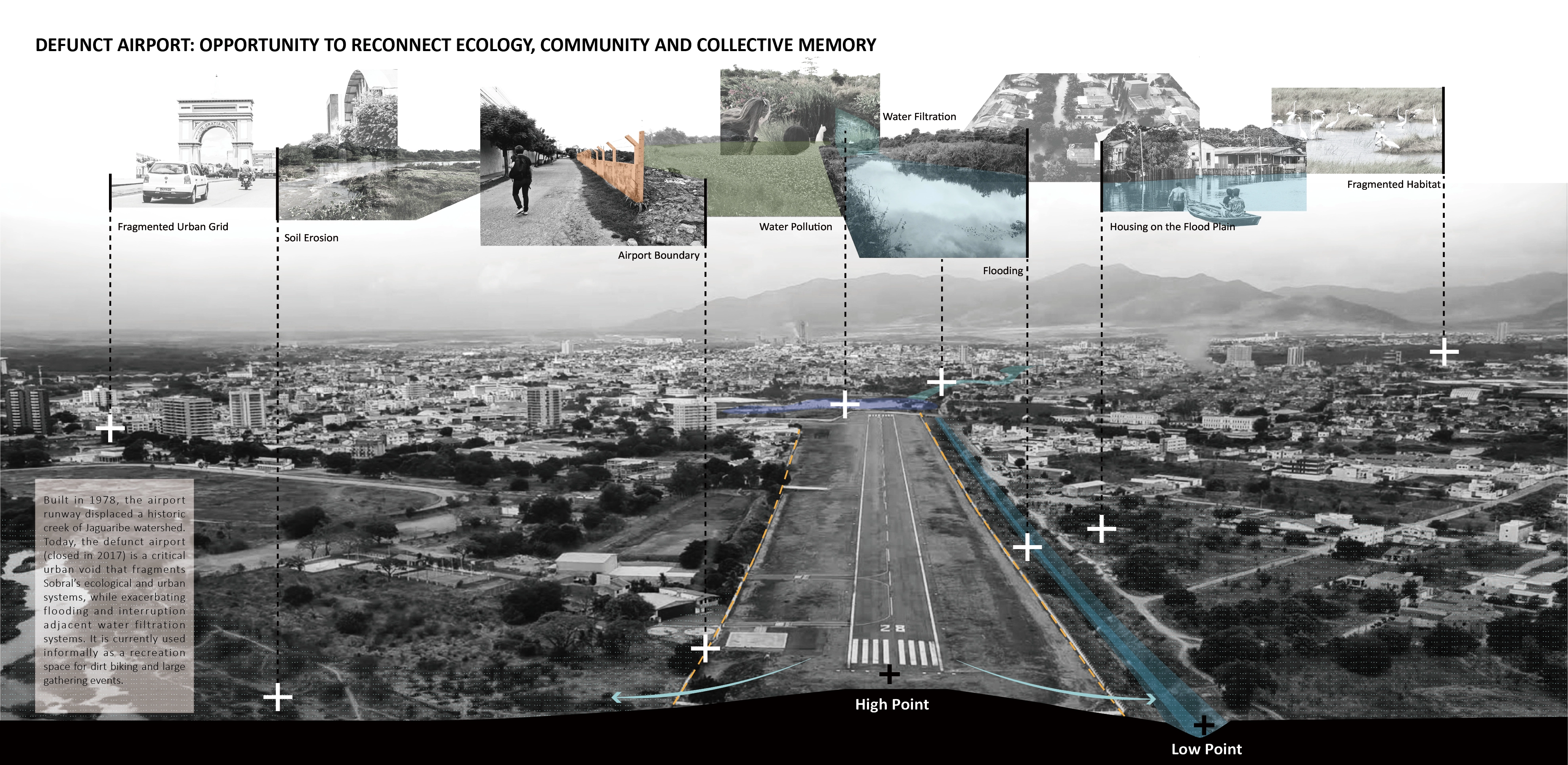 Sobral, Ceará, has long been a center of health, education, and industry, earning its place as the second-fastest-growing city in the state. In 1978, the construction of an airport runway displaced a historic creek within the Jaguaribe watershed exacerbating flooding and disrupting adjacent water filtration systems. The defunct airport, closed in 2017, now stands as a critical urban void, fragmenting Sobral's ecological and urban systems.