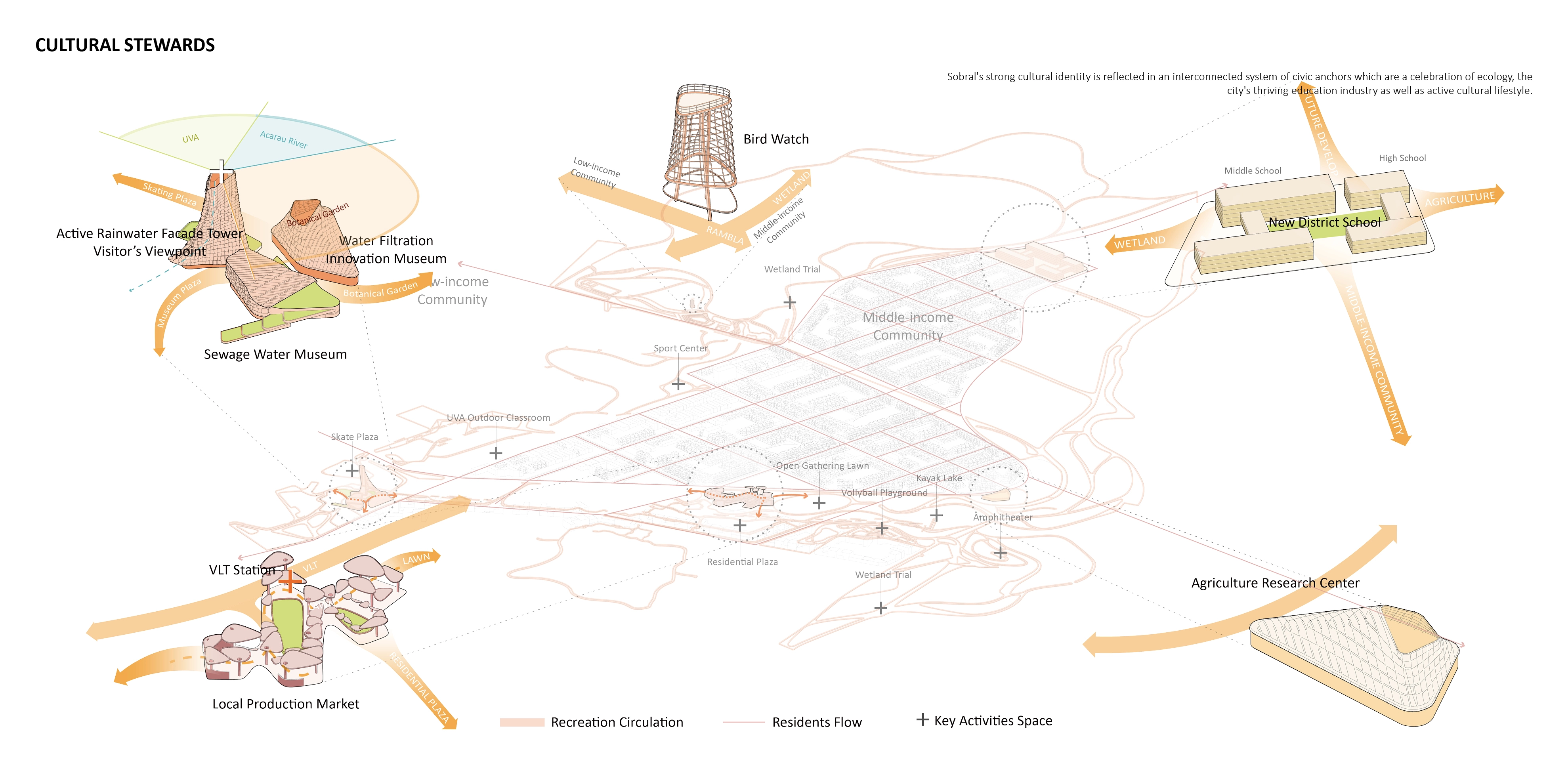 The project exhibits a multi-layered interconnected system- An ecological approach to landscape remediation with a blue-green armature, a cohesive urban development that stitches fragmented neighborhoods as well as Sobral's strong cultural identity reflected in an interconnected system of civic anchors. These interconnected systems are showcased through four major nodes.