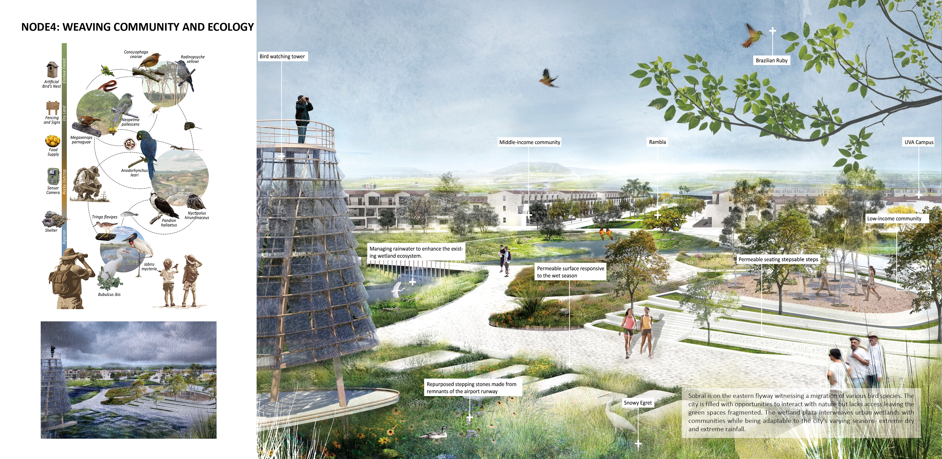 Sobral lies on the eastern flyway, witnessing the migration of various bird species. The city is filled with opportunities to interact with nature like the nearby Heron's lake but lacks access, leaving green spaces fragmented. The wetland plaza interweaves urban wetlands with communities while being adaptable to the city's varying seasons—extreme dry and extreme rainfall.