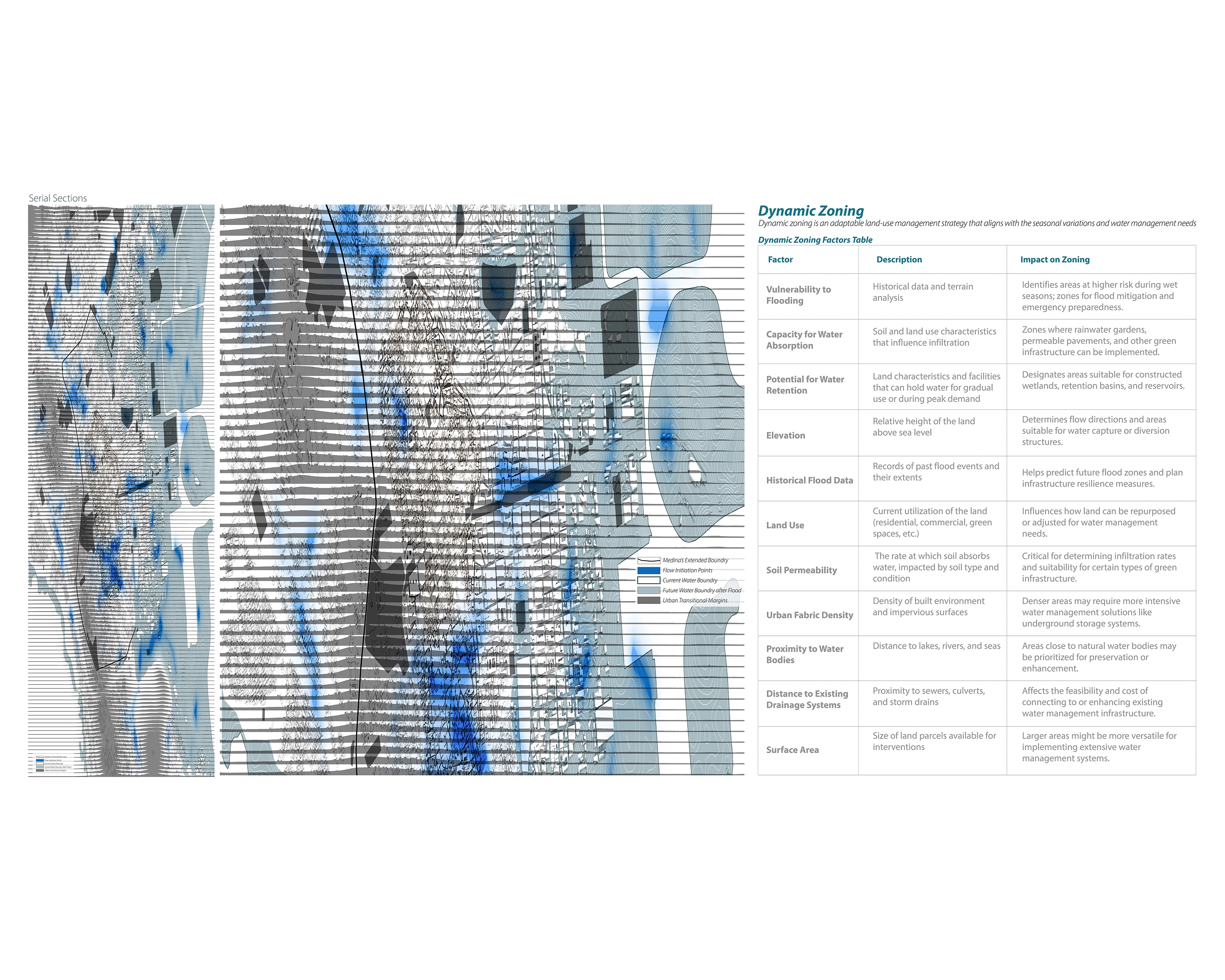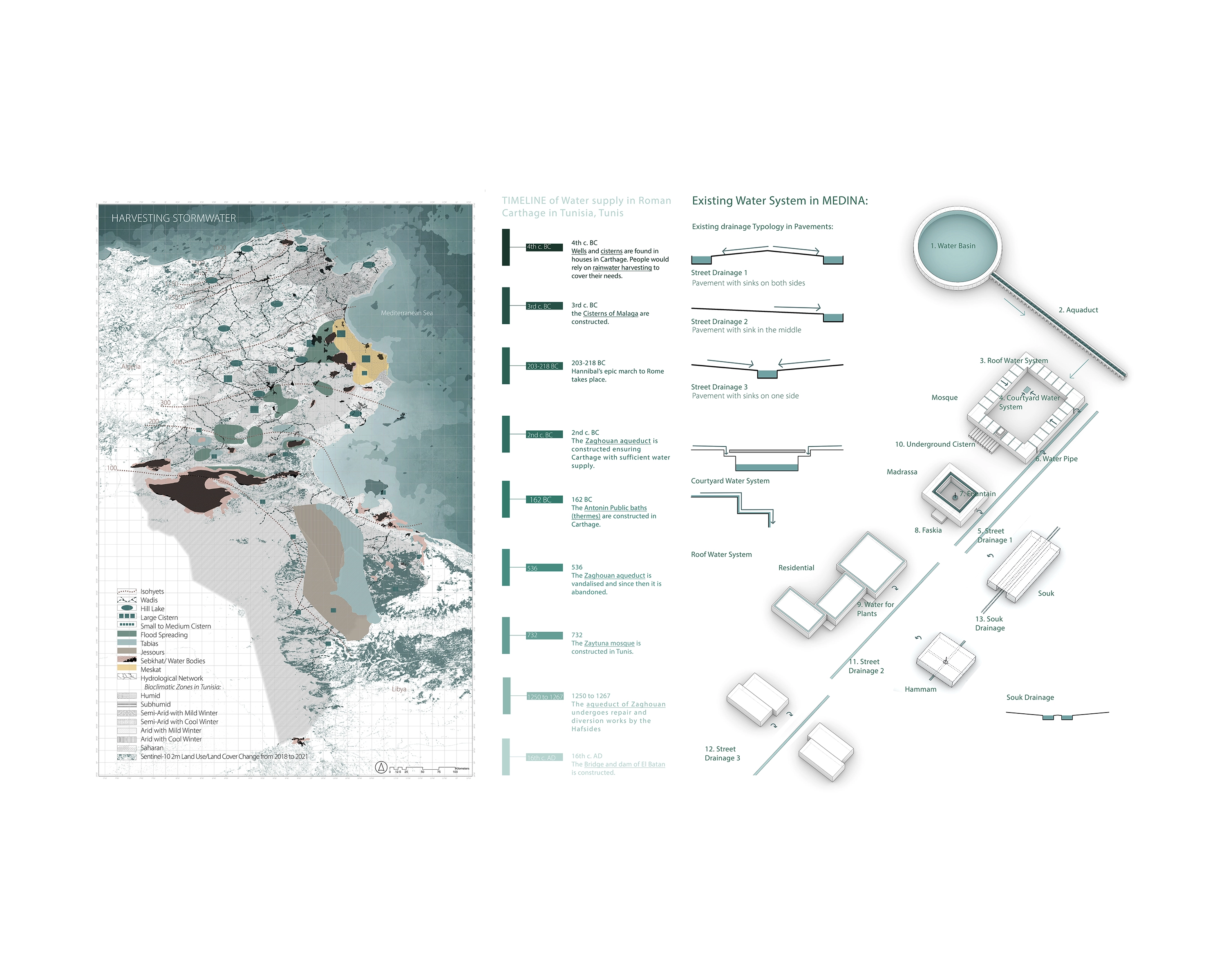 This thesis proposes adapting traditional water management practices for the colonial city of Tunis to reduce flash flood impacts by 9%, while nurturing spaces for flood control, temperature regulation, and social interaction. Colonial and post-colonial development ignored water systems, and climate change has worsened the situation.The study developed a “shallow water dictionary” and documented multi-scalar traditional water management practices as a manual for future landscape architectural in Tunis.This project proposes an updated version of the traditional North African water management systems to address critical urban issues in Tunis: sea level rise and flash floods, rising temperatures, social vulnerability, and habitat preservation.