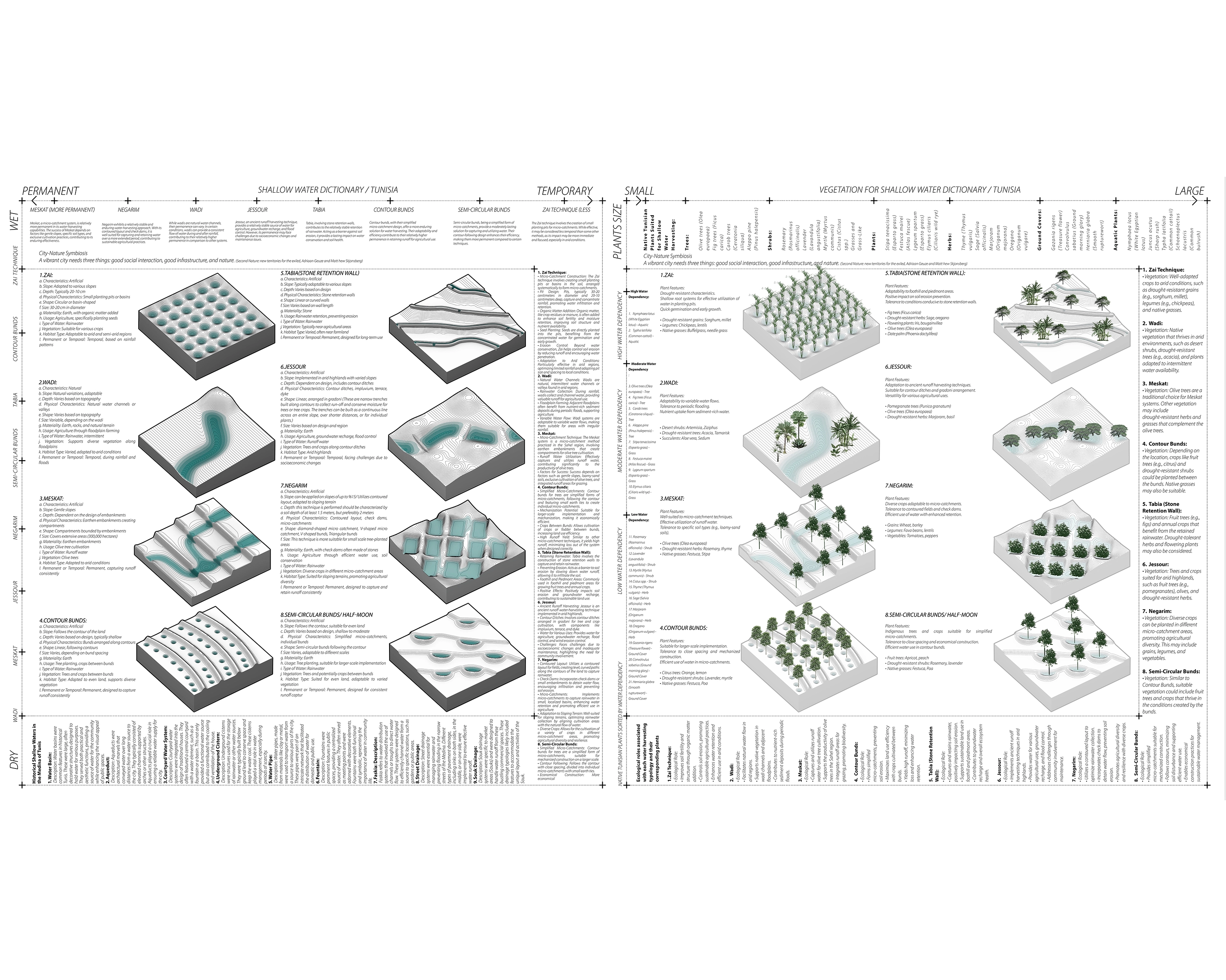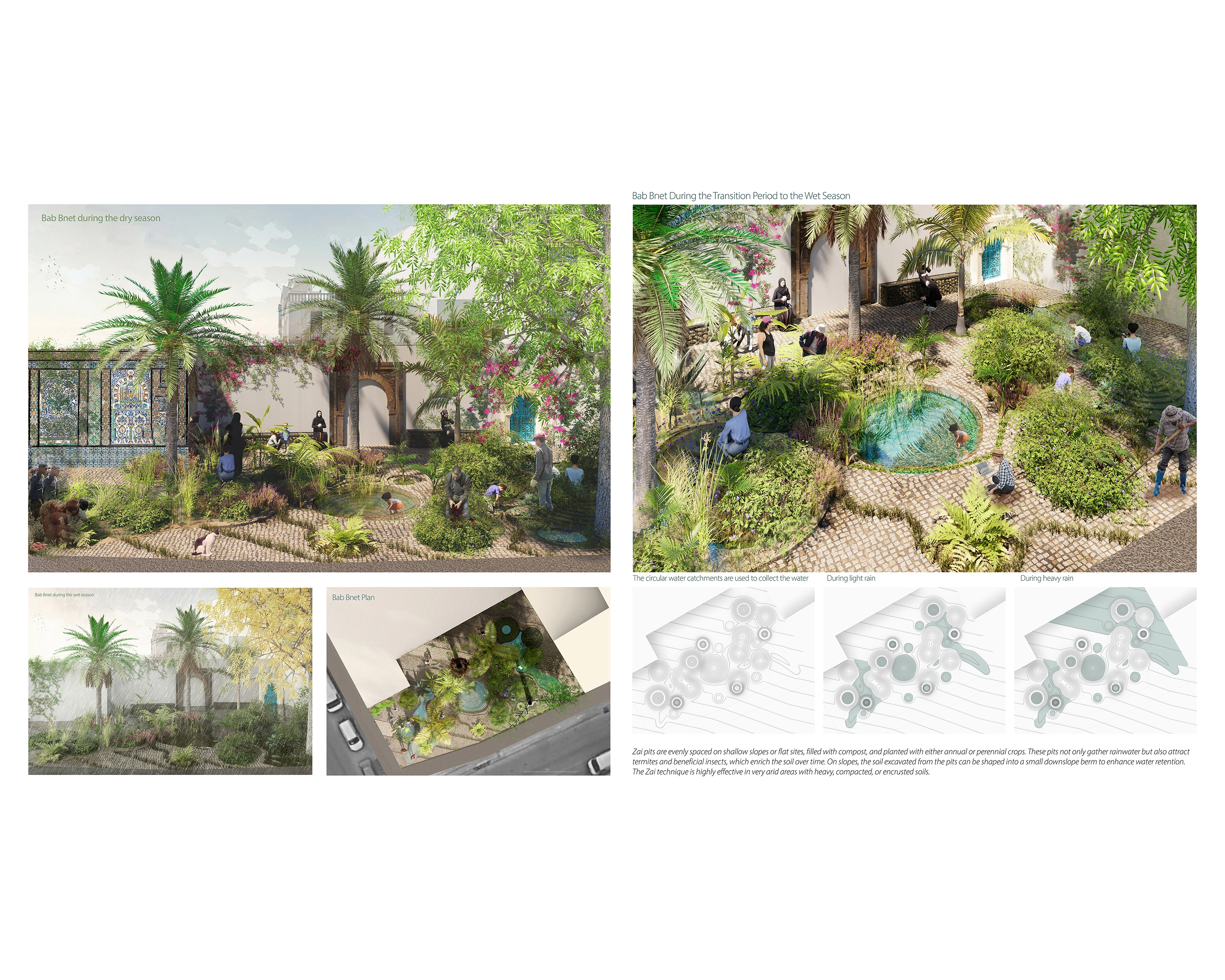 All 84 sites require a water management timeline with wet and dry seasons and two transitional periods. Al Habib Thamer Park (XL size) uses the Jessour and Tabia traditional systems based on their size and slope. Jessour involves building stone dams to slow water movement and prevent erosion, and acts as a sponge during the wet season, absorbing rainwater to prevent flooding and storing it in the soil. Tabia, which features terraced fields for water retention and soil fertility, was adapted for steeper areas of the park. In the dry season, the park becomes productive, providing food and economic benefits while maintaining a cool oasis for recreation. Medium-sized sites, such as the Bab Souika, were designed with the half-moon typology, while small sites, like Bab Bnet, utilized the Zai system.