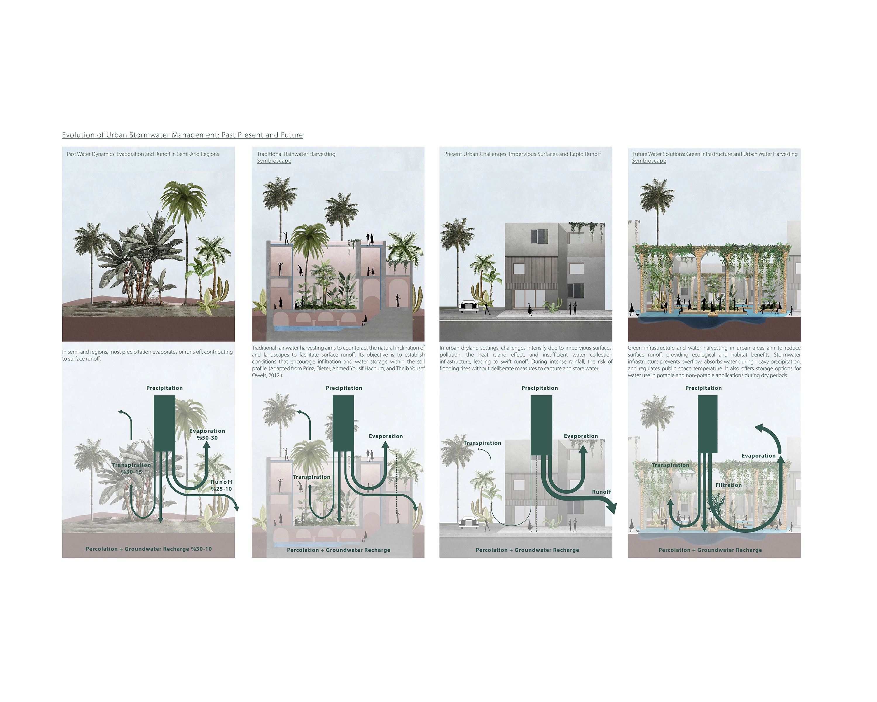 "The Oasis Effect" serves as a model for transforming urban areas, especially in arid regions, by restoring and adapting traditional water management systems to create a resilient urban environment while respecting historical roots. Interventions in 84 selected sites are expected to mitigate about 9% of inland floods, with the project envisioned to extend beyond these sites, creating a cohesive water management system reminiscent of Medina's historical network.