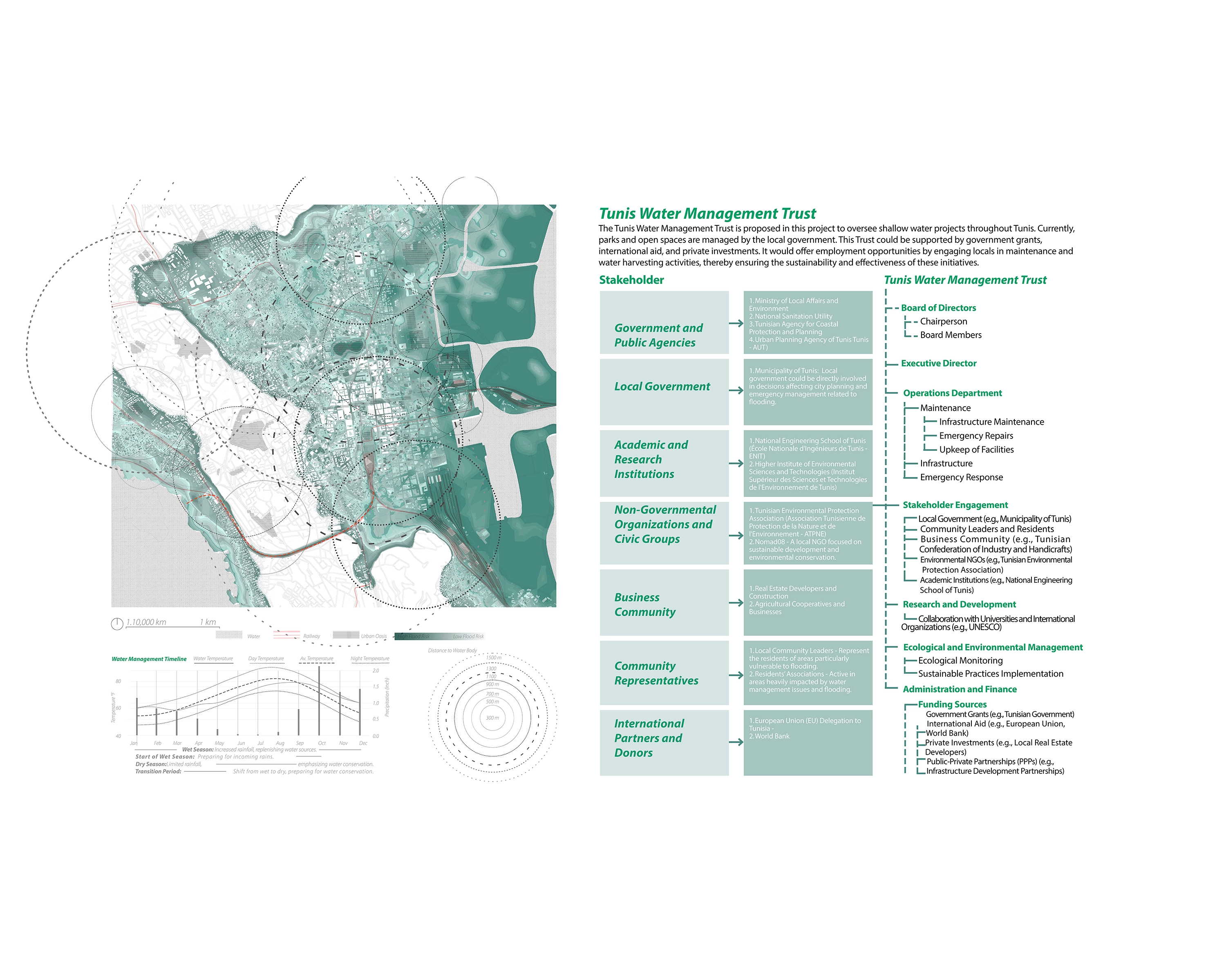Dynamic zoning strategies adapt urban spaces to climatic conditions, converting flood-prone areas into water sponges during rainy seasons and recreational parks during dry periods. This enhances the city's resilience against future climate uncertainties. Along with Dynamic Zoning, the project proposes establishing the "Tunis Water Management Trust" to maintain and manage water systems, involving local communities to ensure sustainability and continuing engagement.