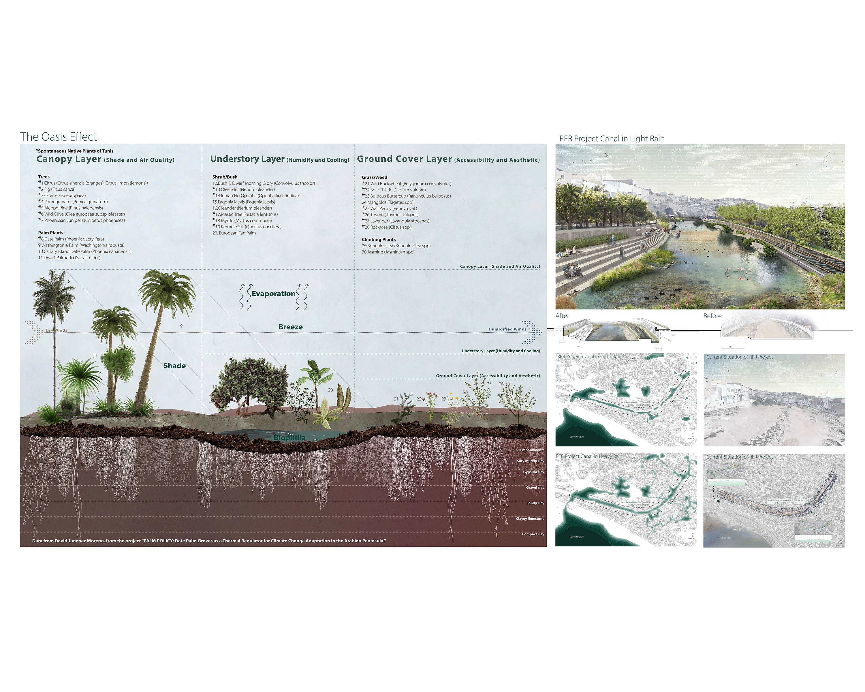 For the urban-scale site, an intervention was proposed based on the adaptive reuse of the inactive Rapid Railway Network of Tunis (RFR) project. The plan is to repurpose it as a canal that mitigates flooding and serves as a recreational green space for the community. The type of shallow water system used for this site is the Wadi system, an ephemeral riverbed that sometimes fills with water and remains dry otherwise.