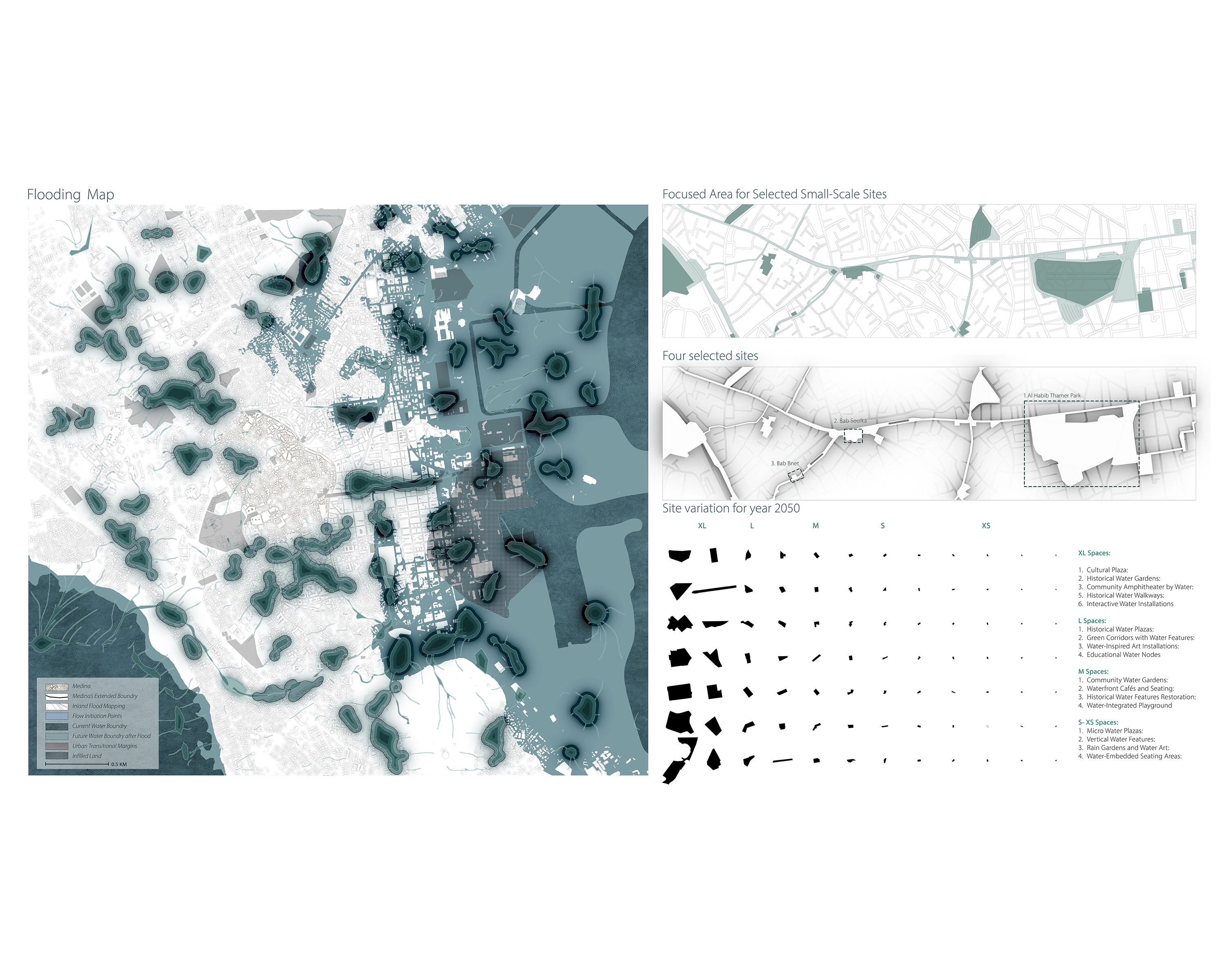 The project identified 84 potential sites across Tunis, including urban leftovers and open spaces, targeted for design by 2050. These sites were categorized by size (XL, L, M, S, XS) to assign appropriate shallow water typologies. One urban and three neighborhood-scale sites were selected: one XL, one M, and one small.