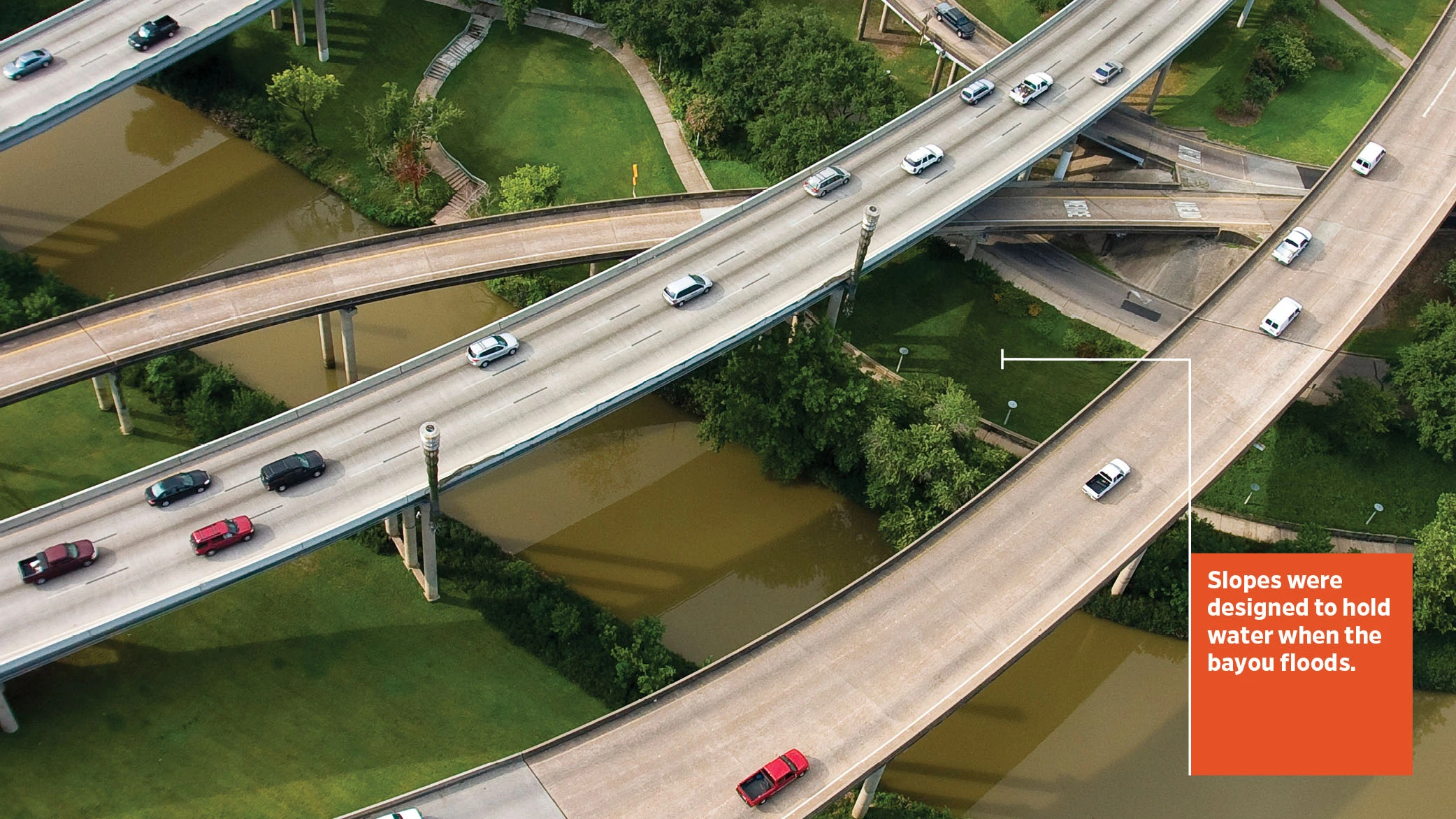 The Buffalo Bayou Promenade turned an inaccessible bayou underneath Houston’s spaghetti of freeways and bridges into a destination linear park with bicycle and walking trails. In addition to its flood management duties, the promenade was designed to improve connectivity—bringing pedestrians and bicyclists to and from Houston’s downtown core to the river park to the west.