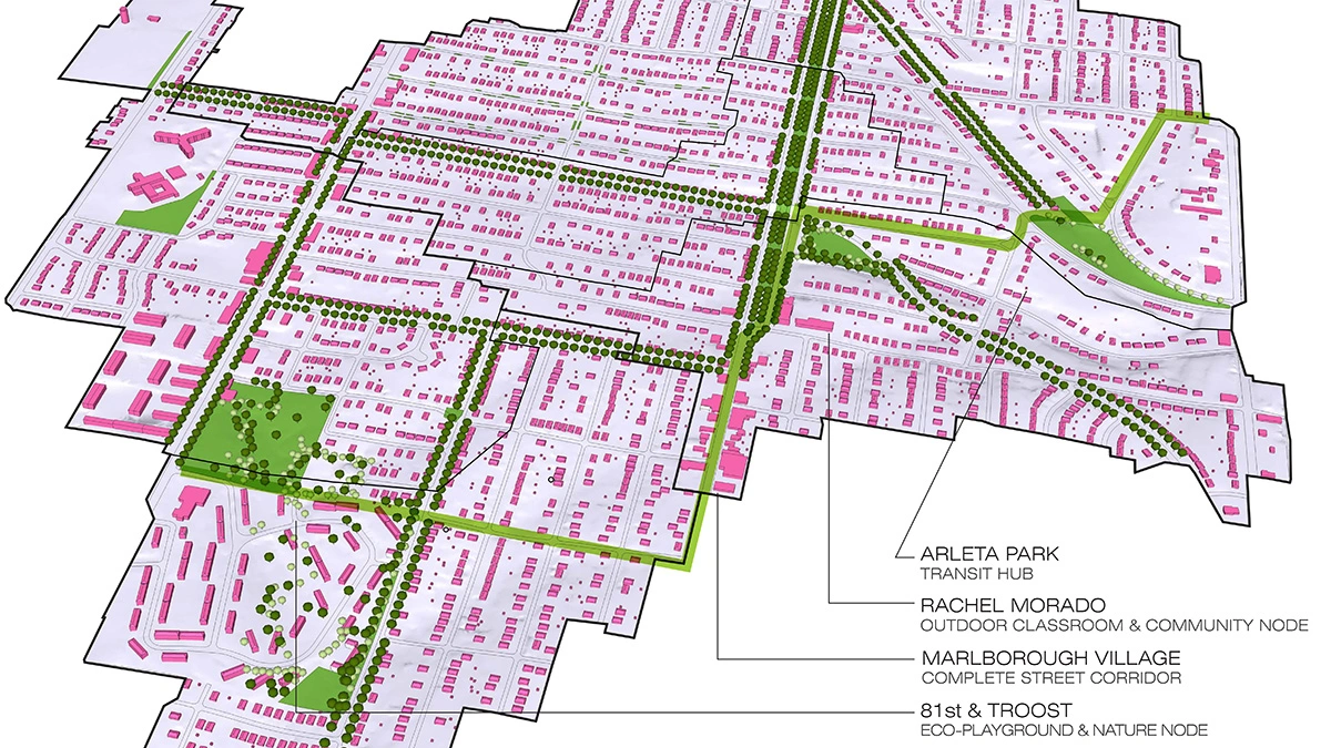The Marlborough community plan developed by Phronesis is part of a broader $40 million green infrastructure investment into the 744-acre Middle Blue River watershed by Kansas City that is focused on community revitalization, health, and sustainability. The investment resulted in a 78 percent reduction in combined sewer overflows into the Blue River.
