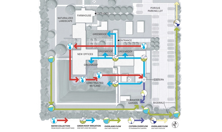 - The landscape is irrigated with a water harvesting system, which collects and reuses 155,000 gallons of stormwater each year.