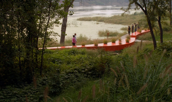 - The park’s “Red Ribbon” steel structure runs 500 meters along the riverbank and is lit from within at night.