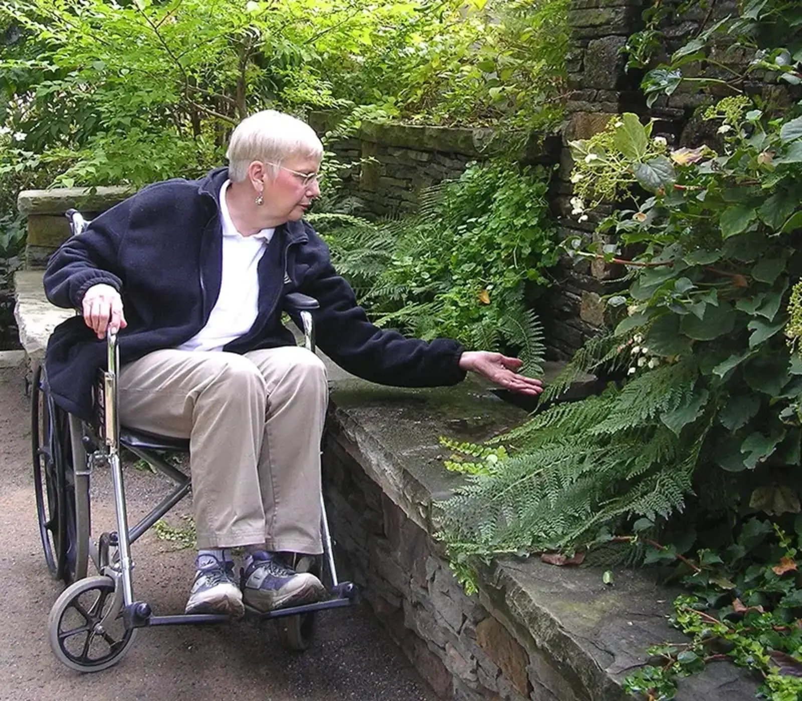 The Elizabeth and Nona Restorative Garden in the Cleveland Botanical Garden, designed by Dirtworks, PC, uses multi-sensory navigation to help blind people or those with low vision, such as changes in humidity and temperature and the sound of water trickling down stones, near the water.