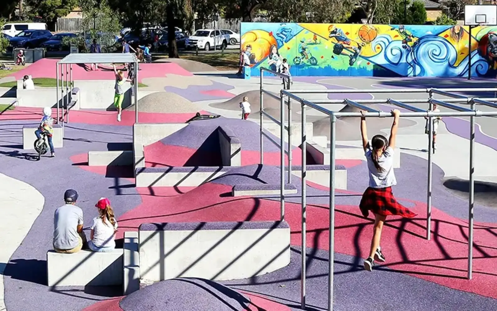 Intergenerational play: Adult oriented equipment often looks like play structures, encouraging children and adults of all ages to play together. Intergenerational play reduces loneliness, encourages family bonding, and promotes active lifestyles.