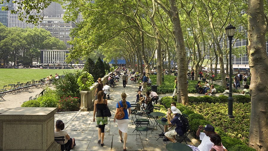 Adding more trees to the built environment is critical in combating air pollution, and landscape architects did just that in projects like Bryant Park in New York City, which provides ample tree cover as well as cleaner, cooler air.