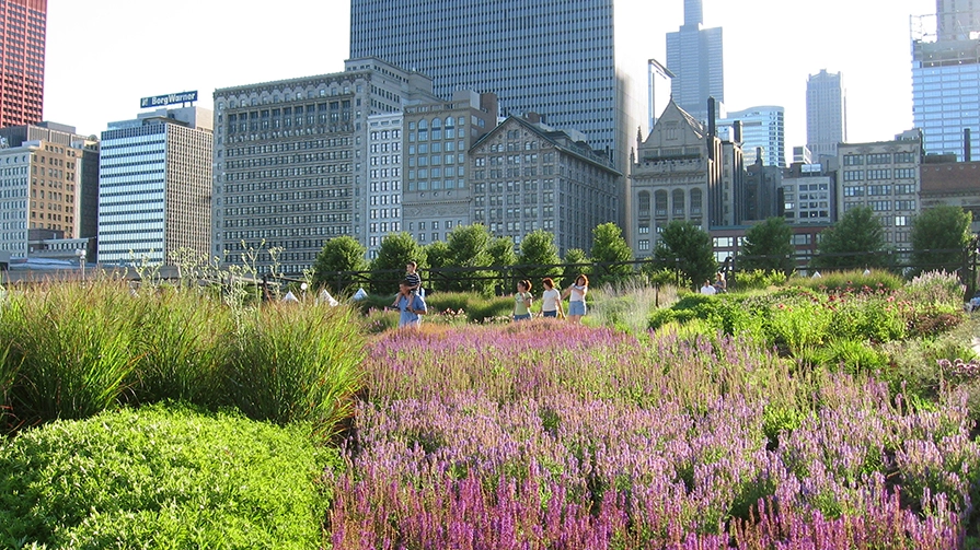 Lurie Garden in Chicago also makes use of water, offering places to sit for spell and inviting people to soak their feet, all within a lush garden densely planted with flowers.