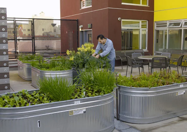 One day, when we went up to the roof garden at the Curran House, I met a resident who was gardening while doing the family laundry. The laundry room is located right off the roof garden. This helps create great social connections with the architecture and landscape. The roof becomes an extension of people's daily lives. On one social level, the roof has inter-connectedness. The garden becomes a social place where people can hang out. They actually might be working next to their neighbor as they're working on their garden plot. It's a community building kind of activity. It's become so popular that they have to do a lottery because more people want to use the little garden plots than are available.