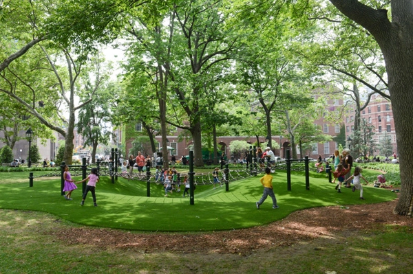I’ve suggested some of the ways Jane Jacobs had a big impact on landscape architecture, public spaces, and park-making. It starts with the concept that parks are for people. But in some ways it’s been a tricky exercise. Jacobs didn’t believe in big plans, and valued the way that Washington Square Park brought people together on a more informal basis. For Jacobs, it was a perfect example of an unplanned and organic space. The fountain basin and outer stone rim, she wrote, is “a circular arena, a theater in the round … with complete confusion as to who are spectators and who are the show. Everybody is both, although some are more so: guitar players, singers, crowds of darting children, impromptu dancers, sunbathers, conversers, show-offs, photographers, tourists, and mixed with them all a bewildering sprinkling of absorbed readers – not there for lack of choice, because quiet benches to the east are half-deserted.”