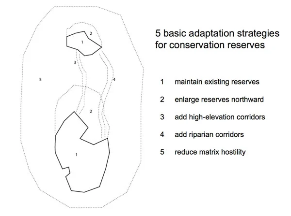 In addition to making sure the conserved patches are shored up with buffers and a region has reduced its “matrix hostility,” climate change creates an imperative to add corridors and stepping stones – both north-south (connecting across latitudes) and up-down (connecting across elevation gradients) – at all spatial scales. As the ecologist Stuart Pimm has pointed out in a recent article, it’s more efficient for species to move a few thousand feet laterally to move up by hundreds of feet of elevation as a way of staying cooler than it is to move tens or hundreds of miles north to get the same benefit. But going up in elevation is like walking the plank, because it means there is less area available as the species go up – and the solution is limited by the maximum height of the hills or mountains available.