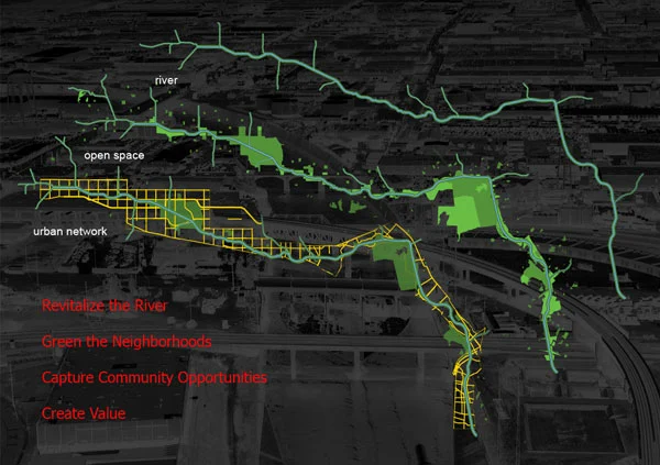 The question is how to break that down into a really effective set of changes, and bring people from their schools and libraries down to the river. Another questoin is how do you actually make the area more connected. How can we use green streets and affect change across the whole overlay zone, not just with signs that say, the river's down there, but actually make it a new kind of space within the city that has a different sense of place. We are proposing to plant thousands and thousands of Sycamore trees there.
