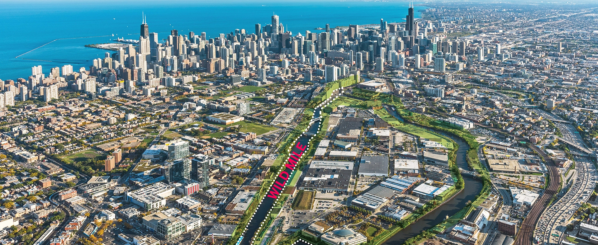 Image credit: ASLA 2024 Professional Urban Design Honor Award. Wild Mile: Transforming an Urban River into a Floating Eco-Park Chicago, Illinois. Omni Workshop and Skidmore, Owings & Merrill / Curtis Waltz © Aerielscapes, Inc. Courtesy of SOM