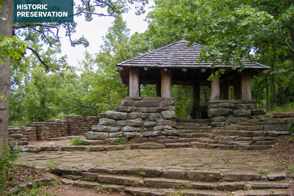 Devil’s Den State Park is one of Arkansas’ first six state parks, all of which were designed and built by the Civilian Conservation Corps. As with other state and national parks of this period, all built elements in the park, including buildings, roads, trails, bridges, dams, signage, furniture, and many other features, were designed in the National Park Service Rustic style. The park is widely regarded as the most intact example of CCC design in Arkansas and still serves as a national exemplar of Rustic style design. HALS documentation of this landscape provides both a general overview of the park and detailed examinations of several representative areas with high historic significance. In addition to the extensively researched historical report, the survey includes a full set of measured drawings.